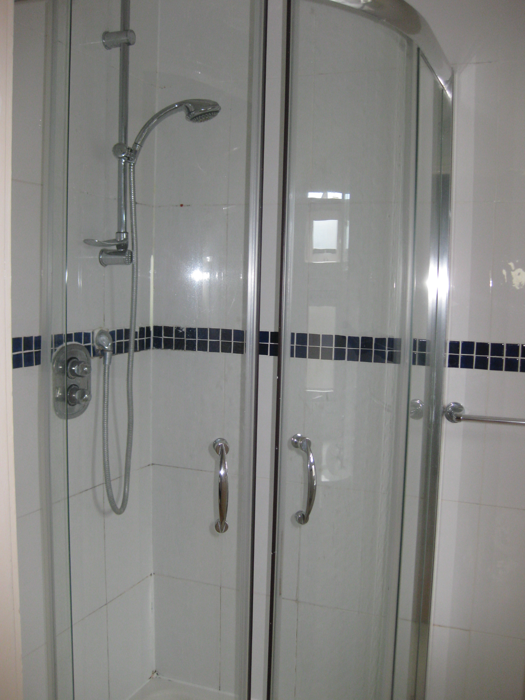 Bathroom: Walk in shower cubicle, low flush WC, wash hand basin, fully tiled walls and floor, double glazed window to side flank wall.