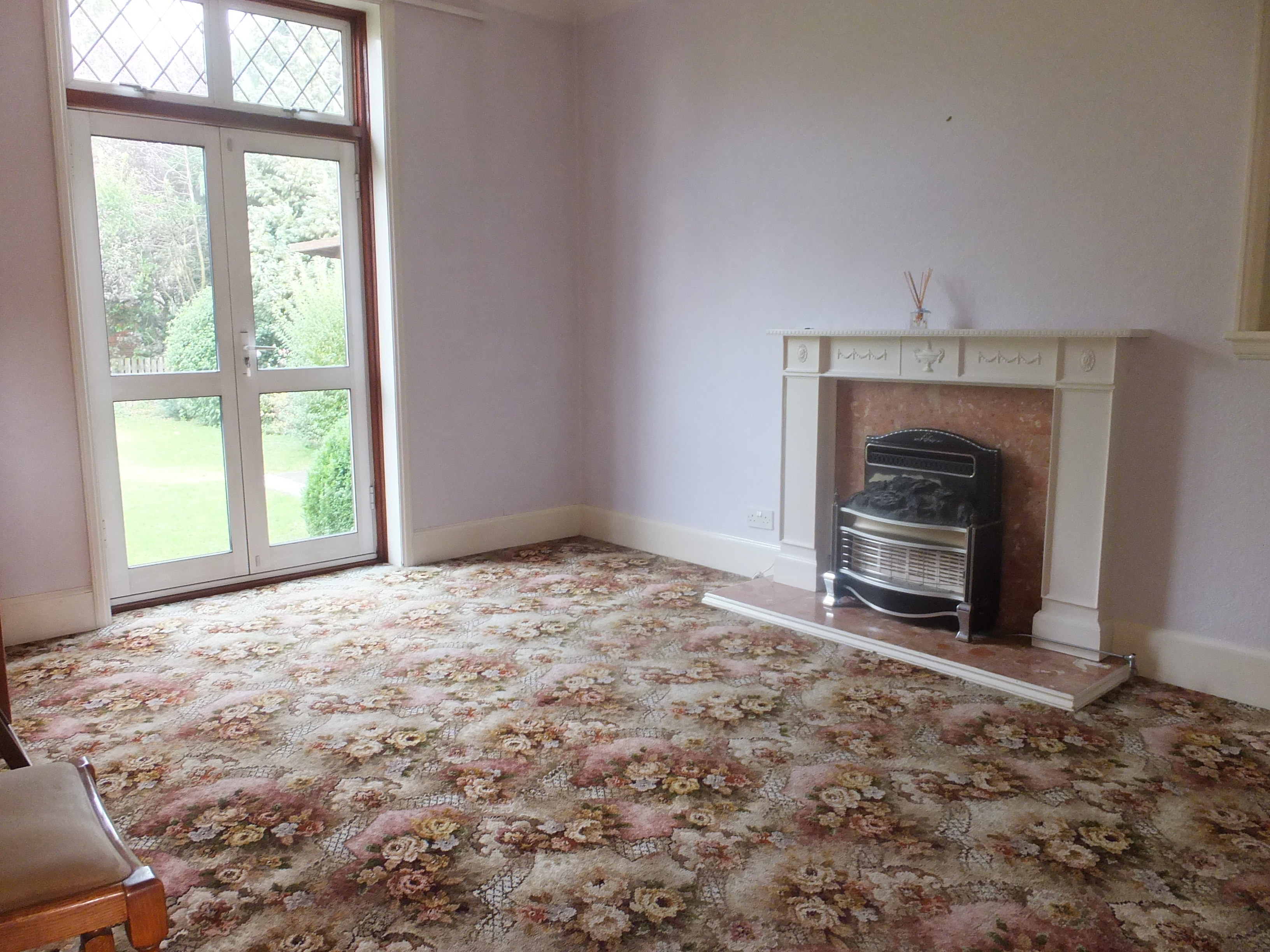Double glazed doors leading onto rear garden, carpeted, power points, radiator and stained glass side window.