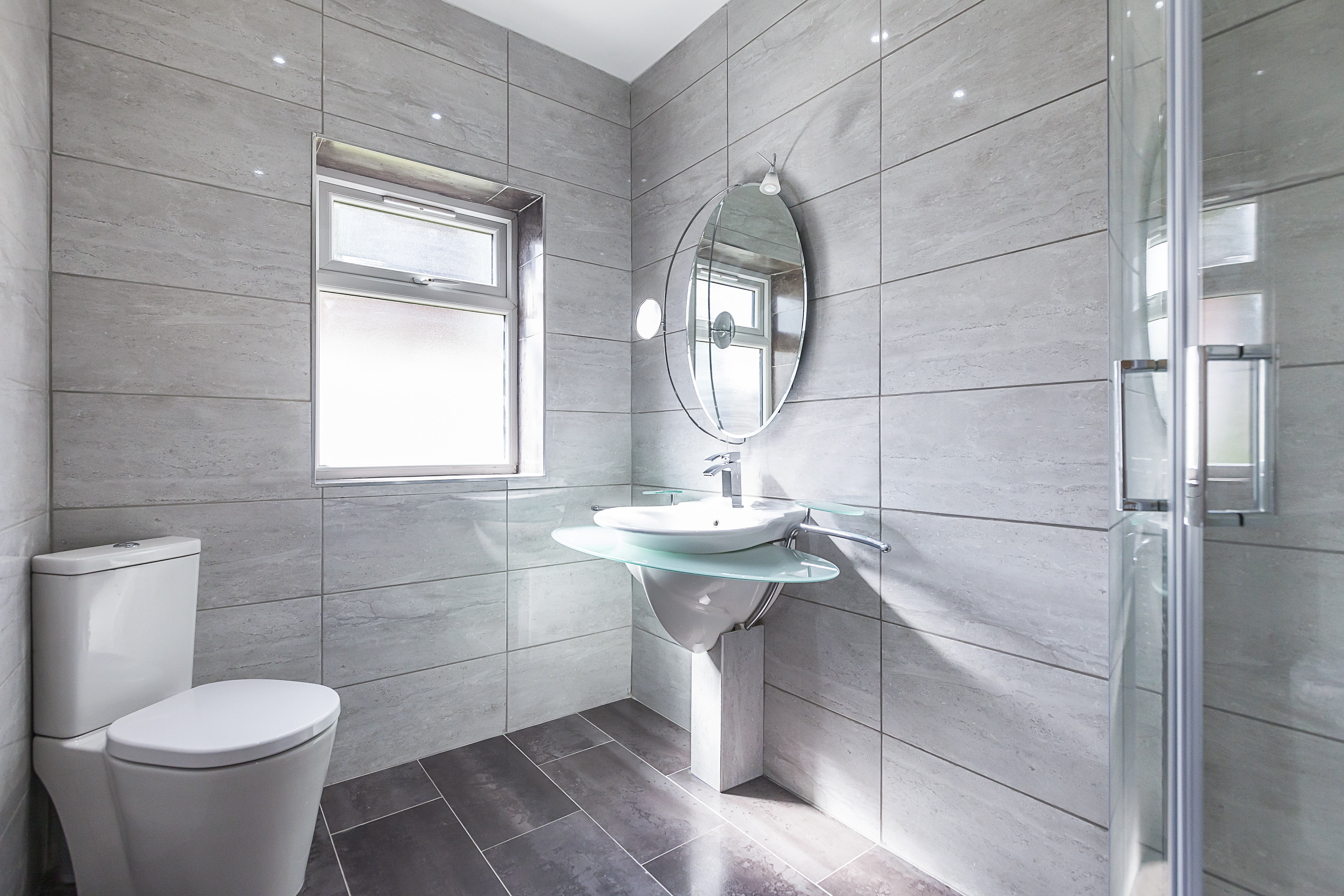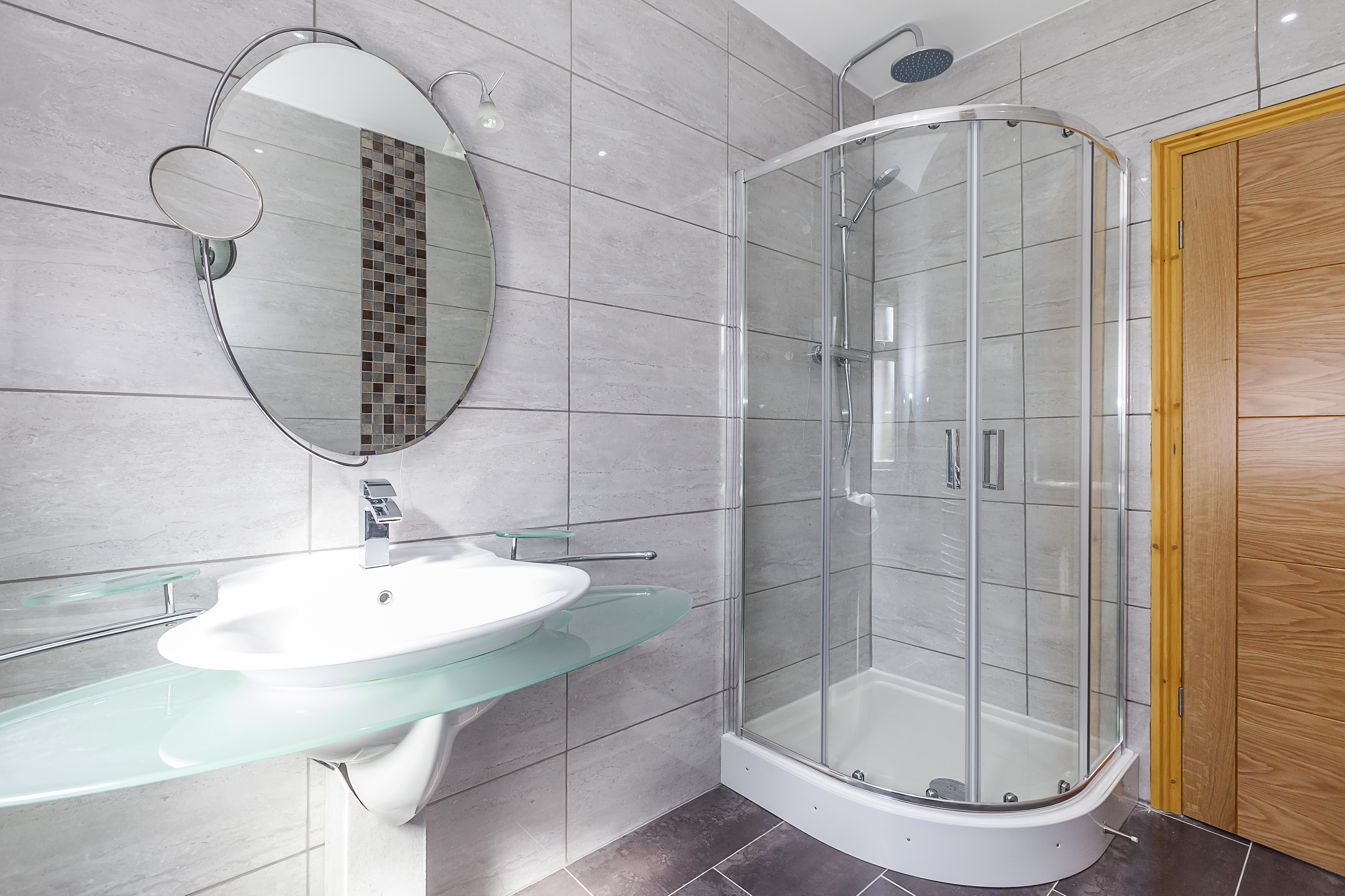 Ground Floor Shower room – pedestal wash hand basin, wall mounted lighted mirror, corner WC, corner walk in shower cubicle with integrated power shower, fully tiled flooring and walls,heated chrome Towel rail, frosted double glazed window to rear aspect, LED inset spot lights to ceiling