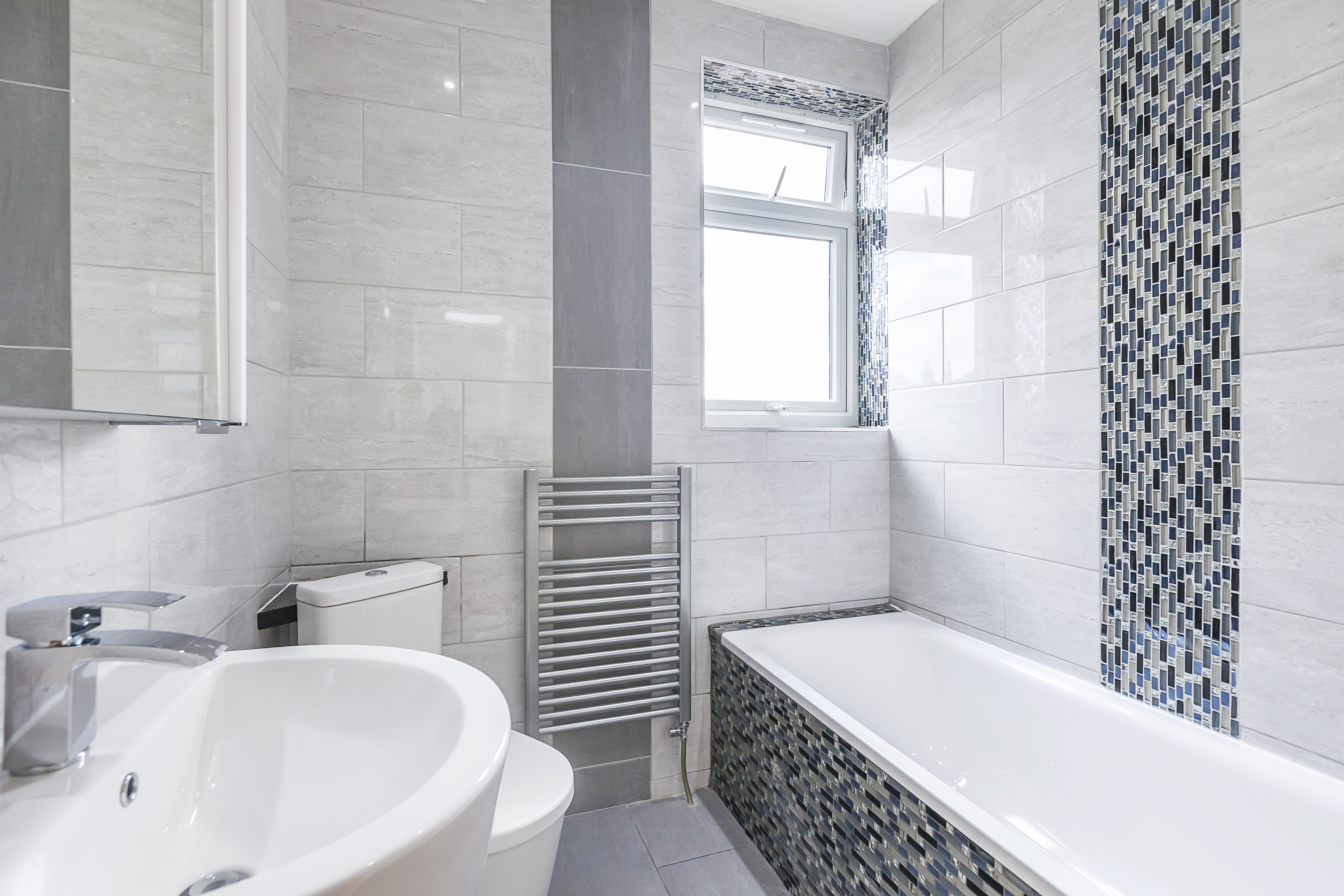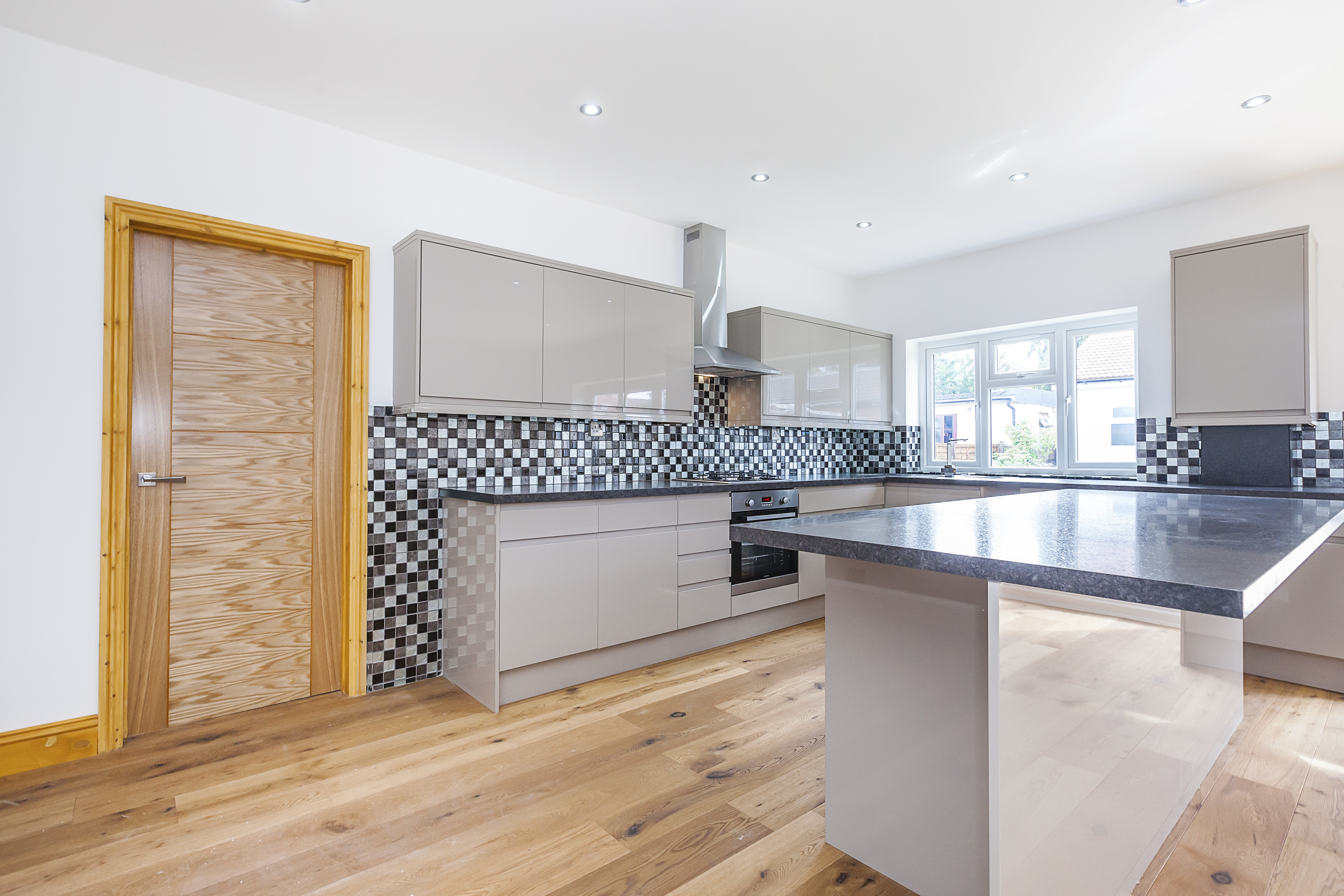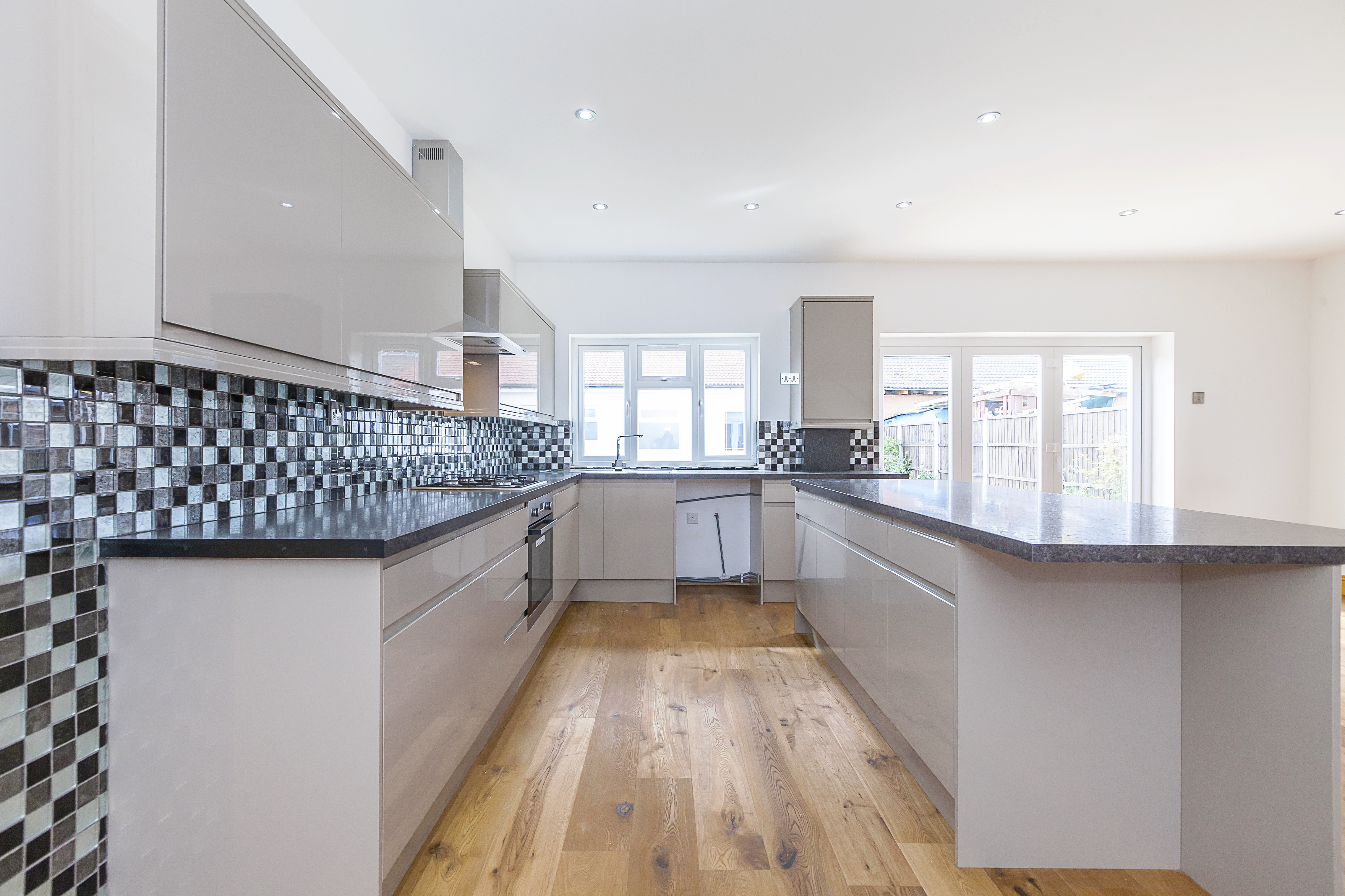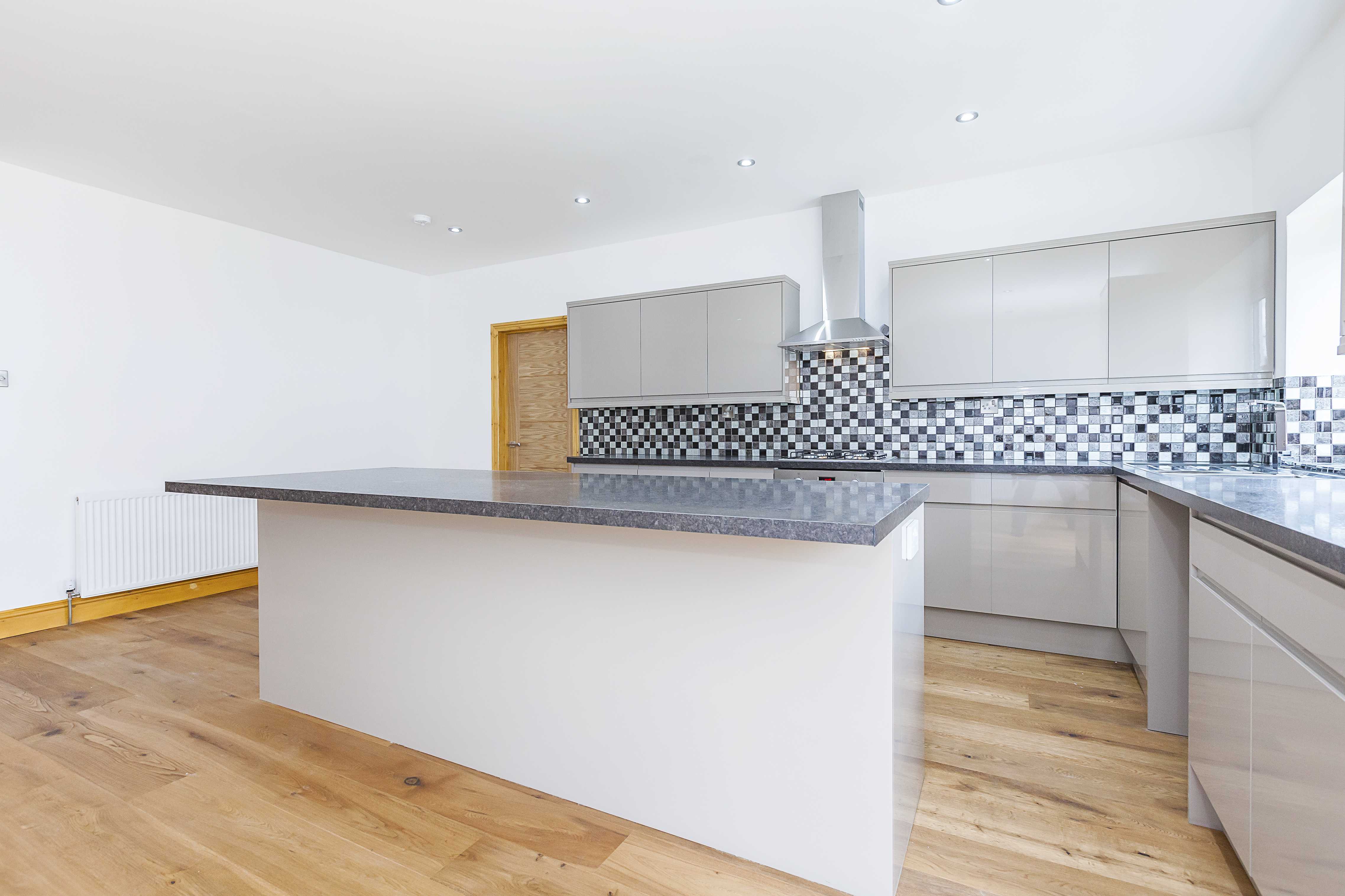 Kitchen – A range of stylish high gloss wall and base units with granite effect worktops, stainless steel sink with side drainer, mixed coloured mosaic glass effect tiled splash backs, integrated Lamona electric oven and gas hob with stainless steel extractor fan over, plumbing for dishwasher, housed wall mounted newly fitted Biasi Combi boiler, double glazed window to rear aspect, LED inset spot lights to ceiling.