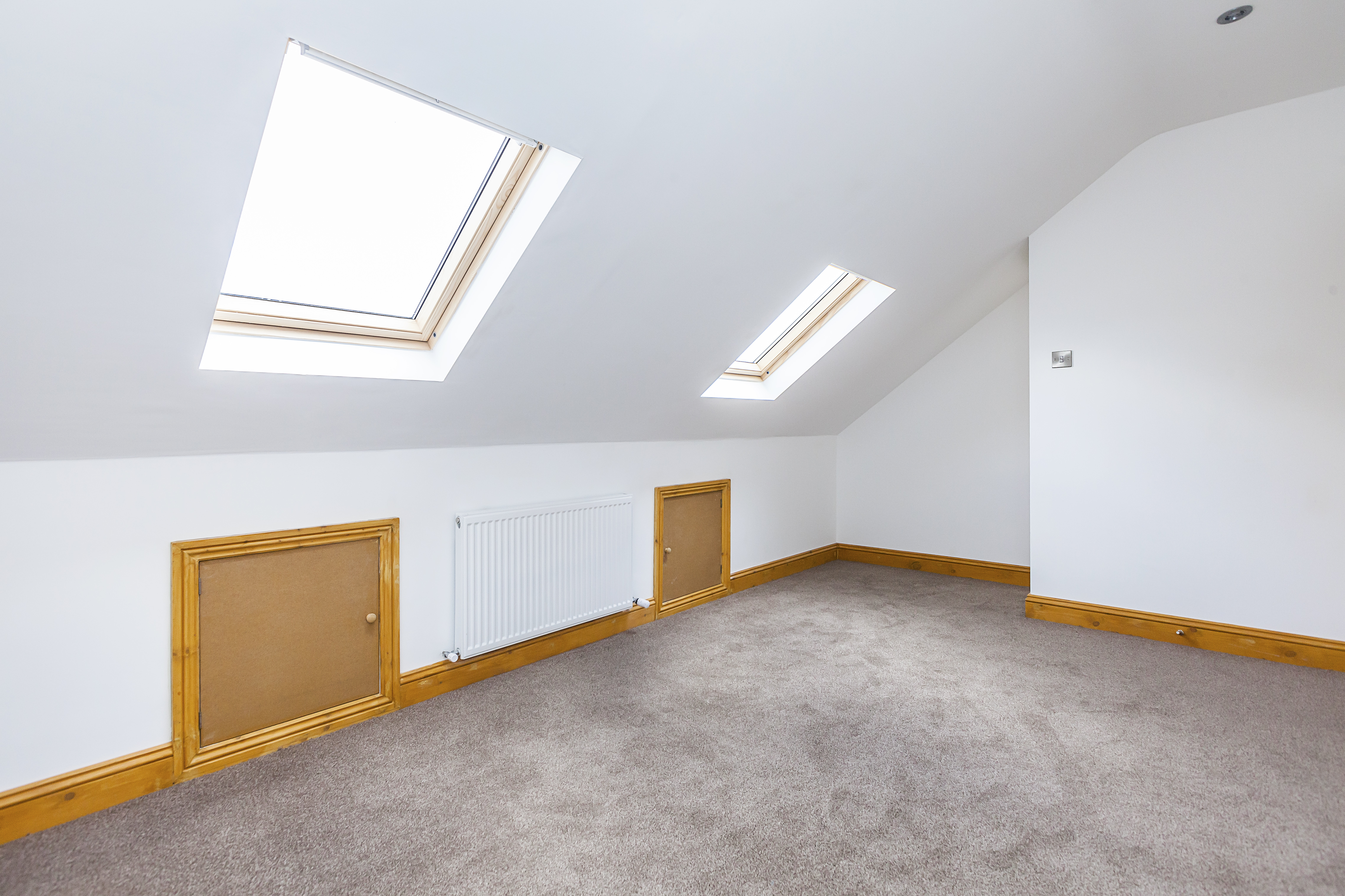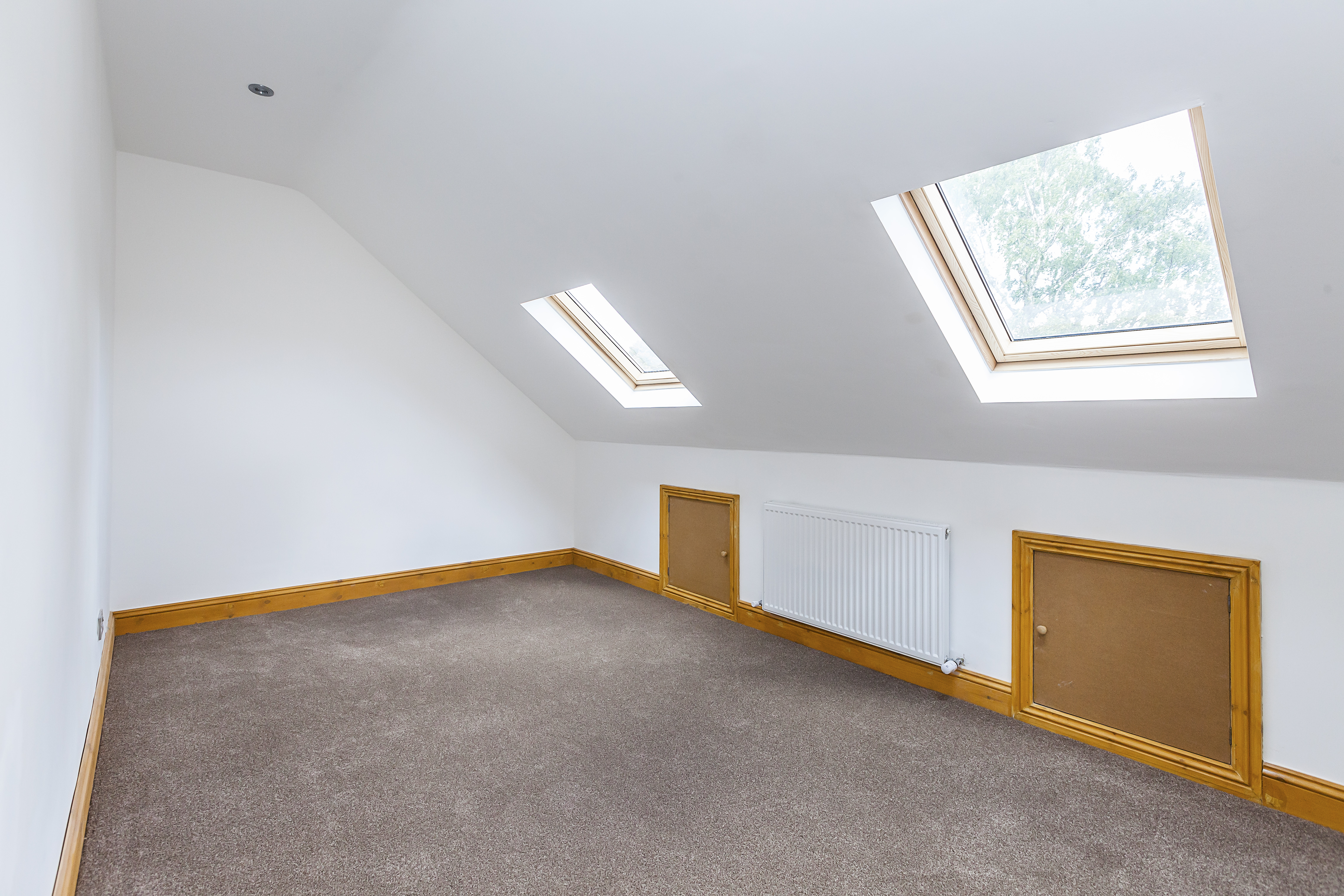 Bedroom Five – 18’2″ x 9’4″ – Velux window x 2, radiator,eaves storage, fitted carpet, walk in wardrobe area with radiator and velux skylight window, LED inset spot lights to ceiling