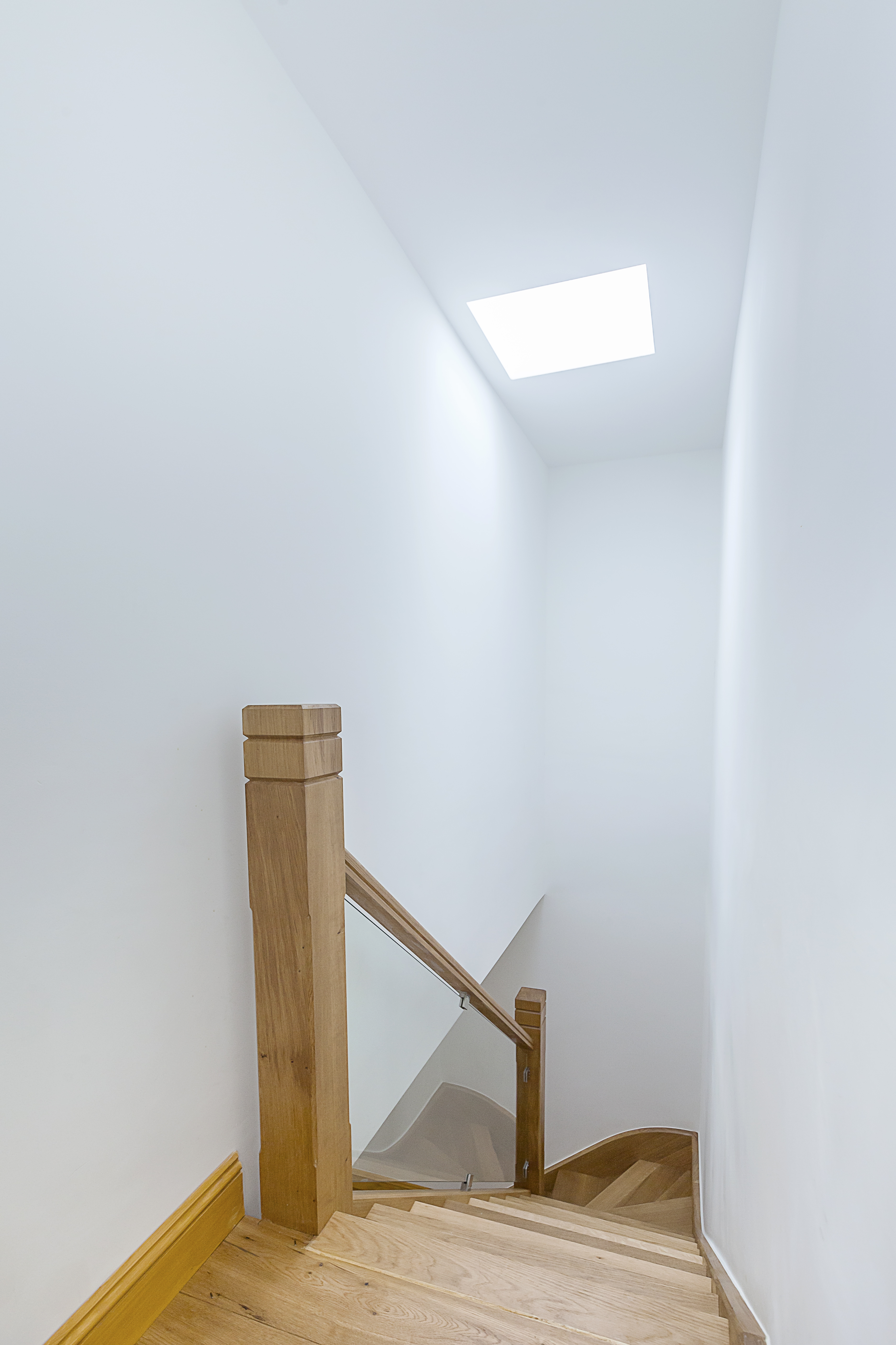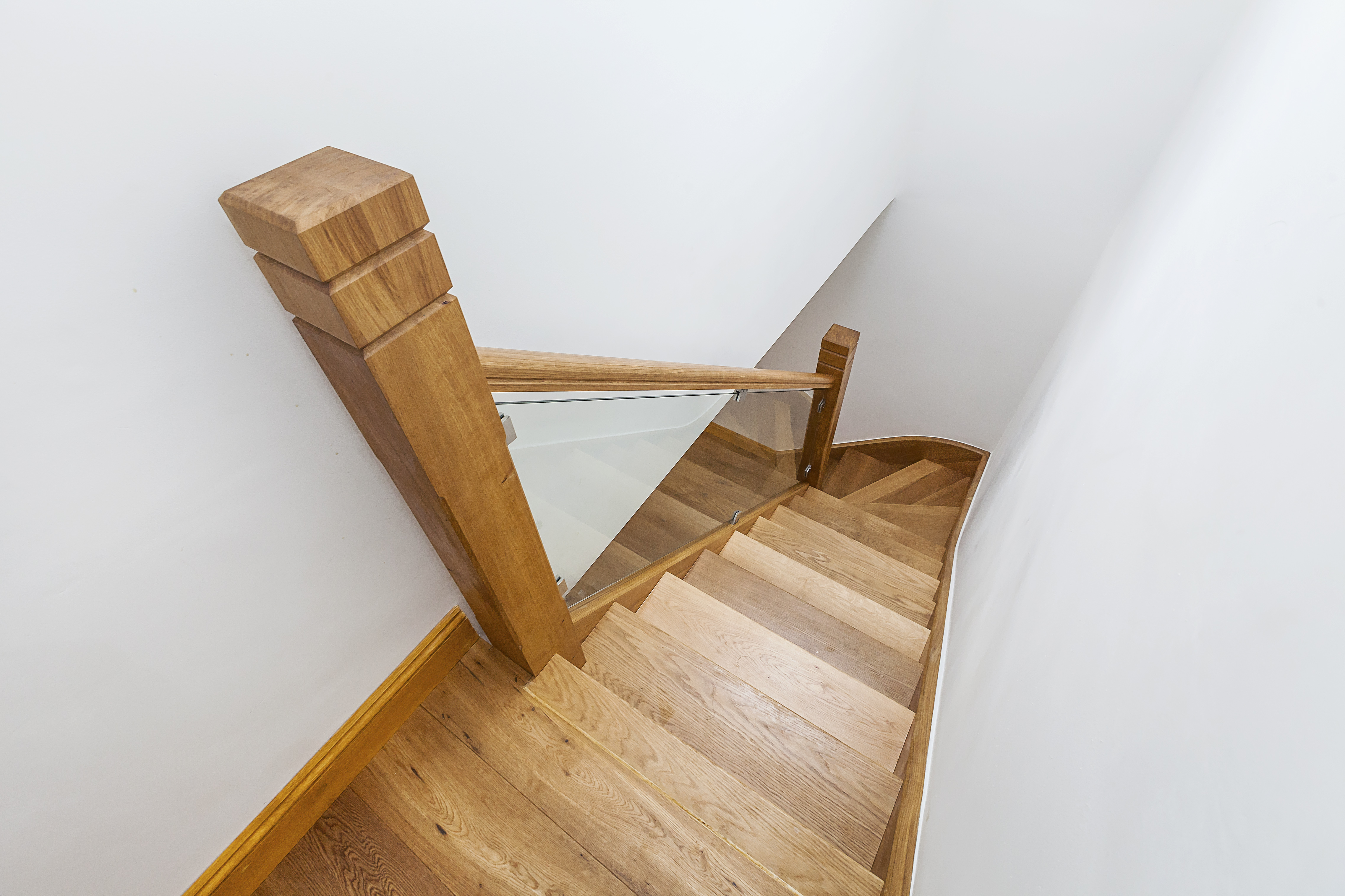 Solid oak staircase rising to the first floor landing: LED inset spot lights to ceiling, doors leading to: