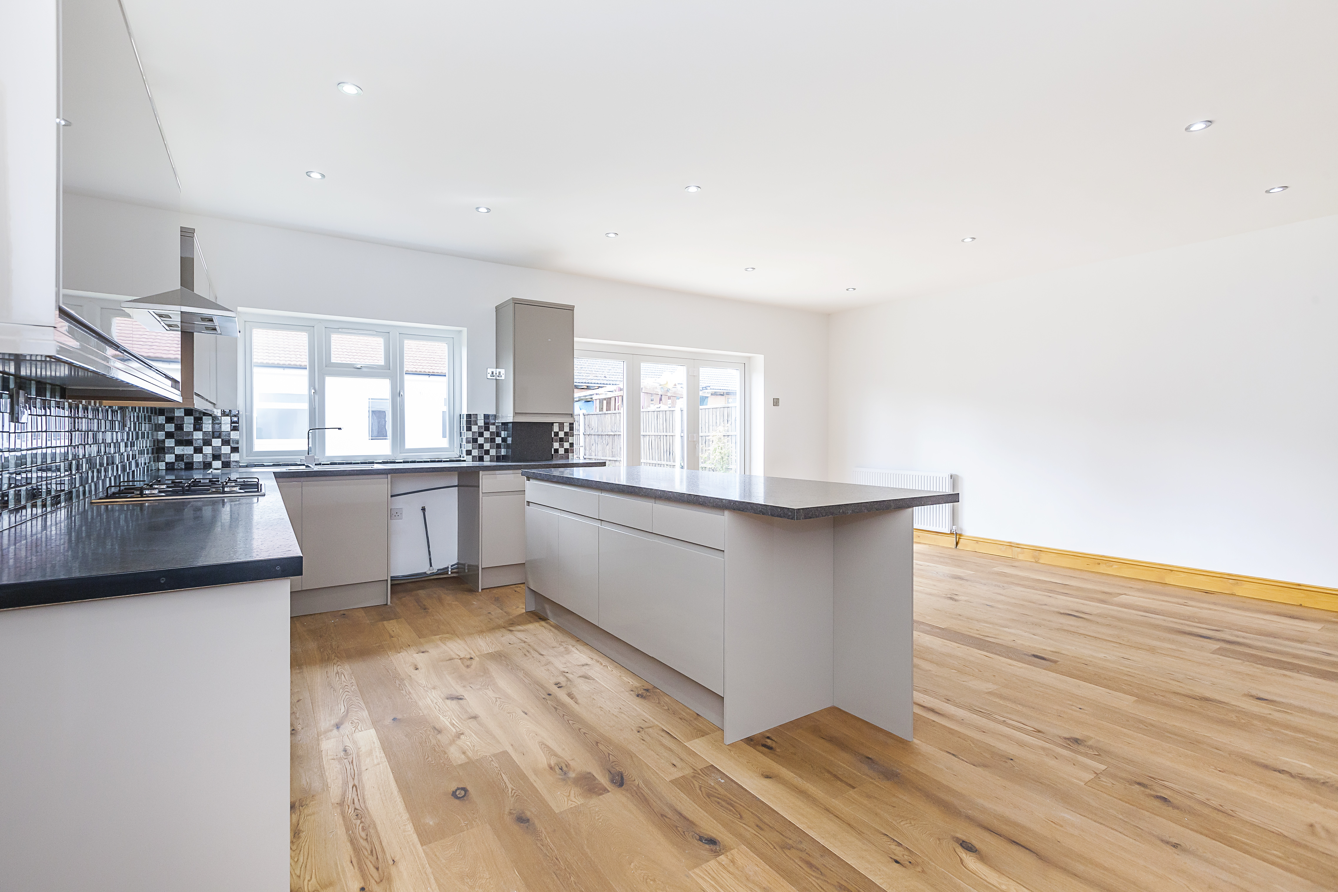 L- shaped open plan lounge to kitchen: 20’10” x 18’5″ with modern island breakfast bar