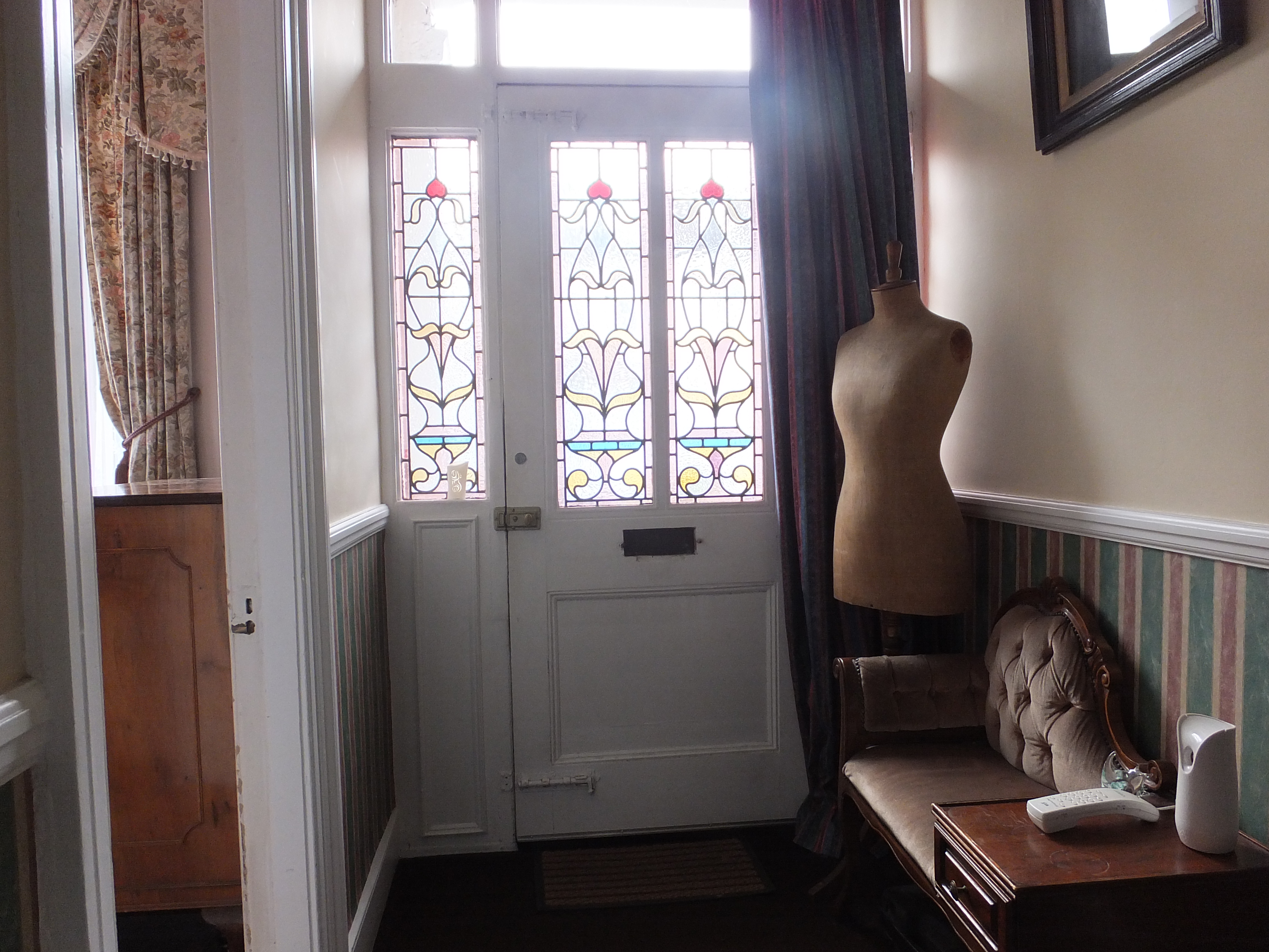Reception Two: 15’8″ x 12’3″ Featured bay window to rear incorporating stained glass door to rear, molding to ceiling, picture rail carpeted, gas fire and power points.