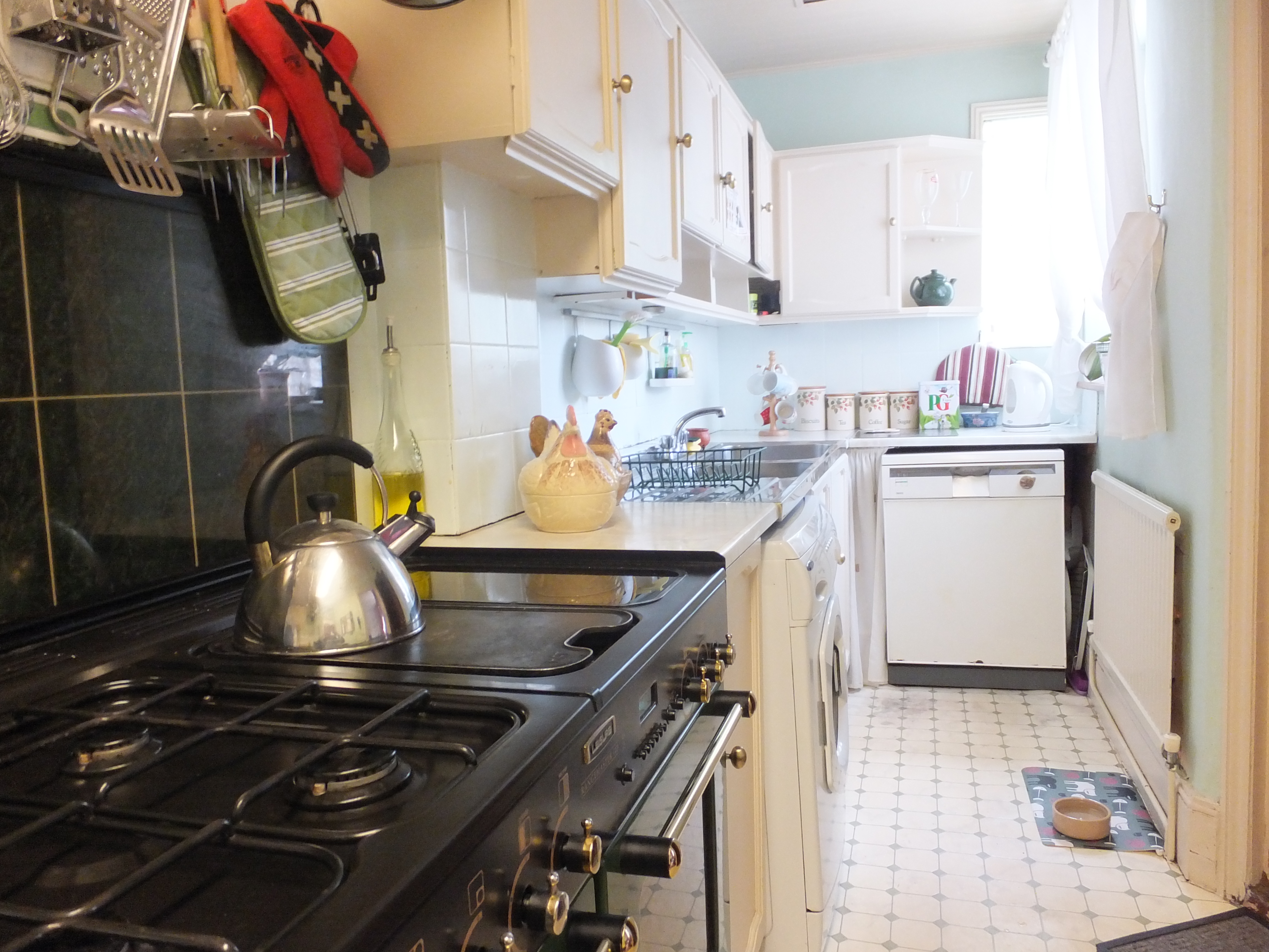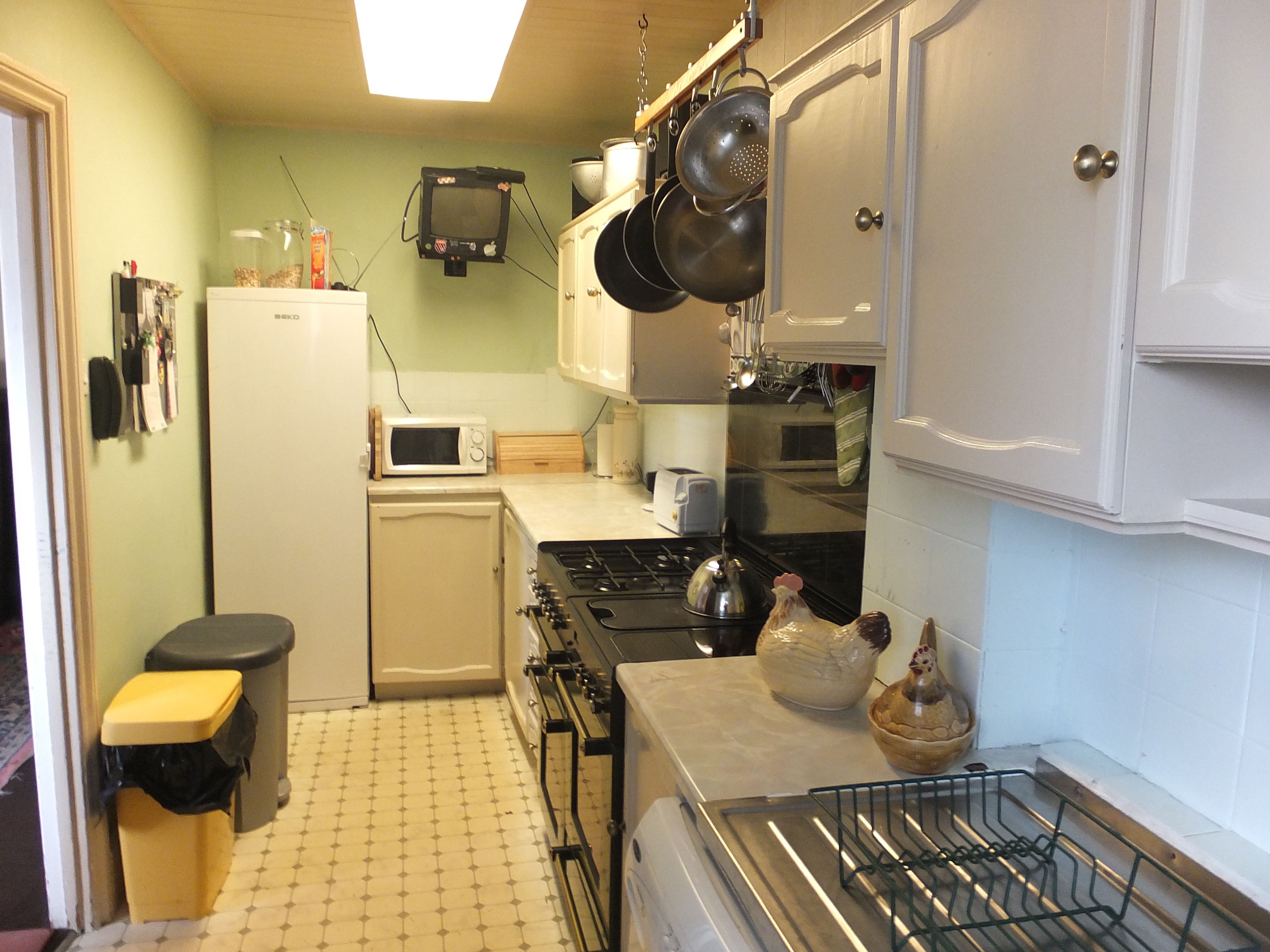 Kitchen: 18’9″ x 5’9″ Fitted with complete range of wall and base units with roll top work surfaces and tiled splash backs. Stainless steel double sink unit, pluming for washing machine and dishwasher. Door leading to rear garden.