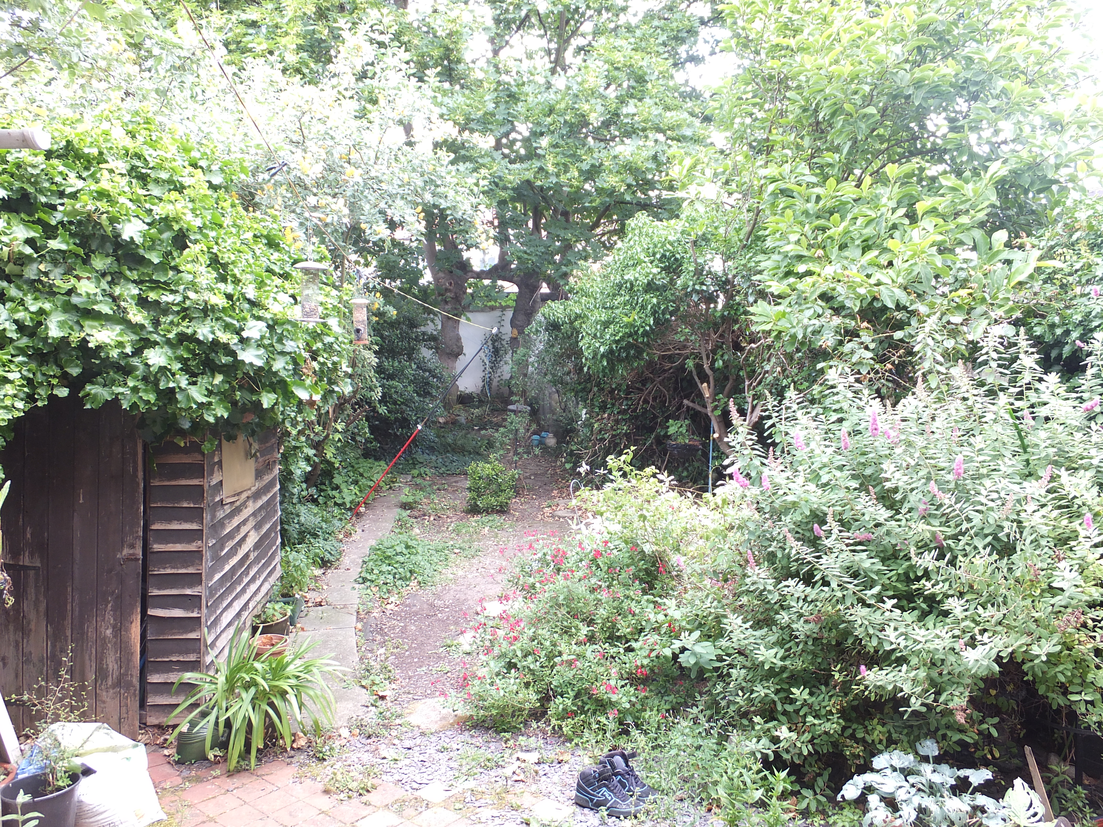 Rear Garden Approximately. 50ft Half tile and slate patio area leading to area of mature trees and shrubs.