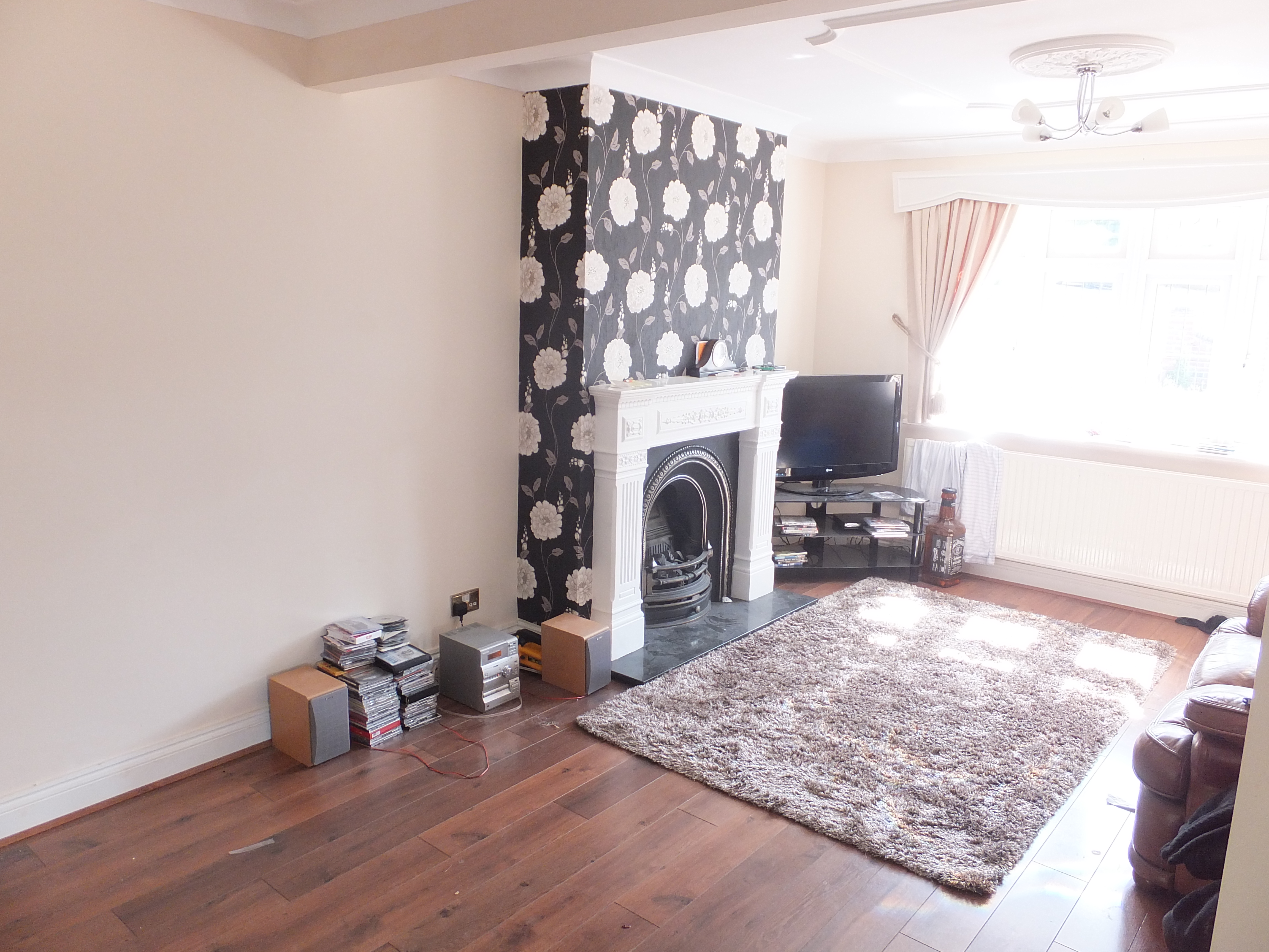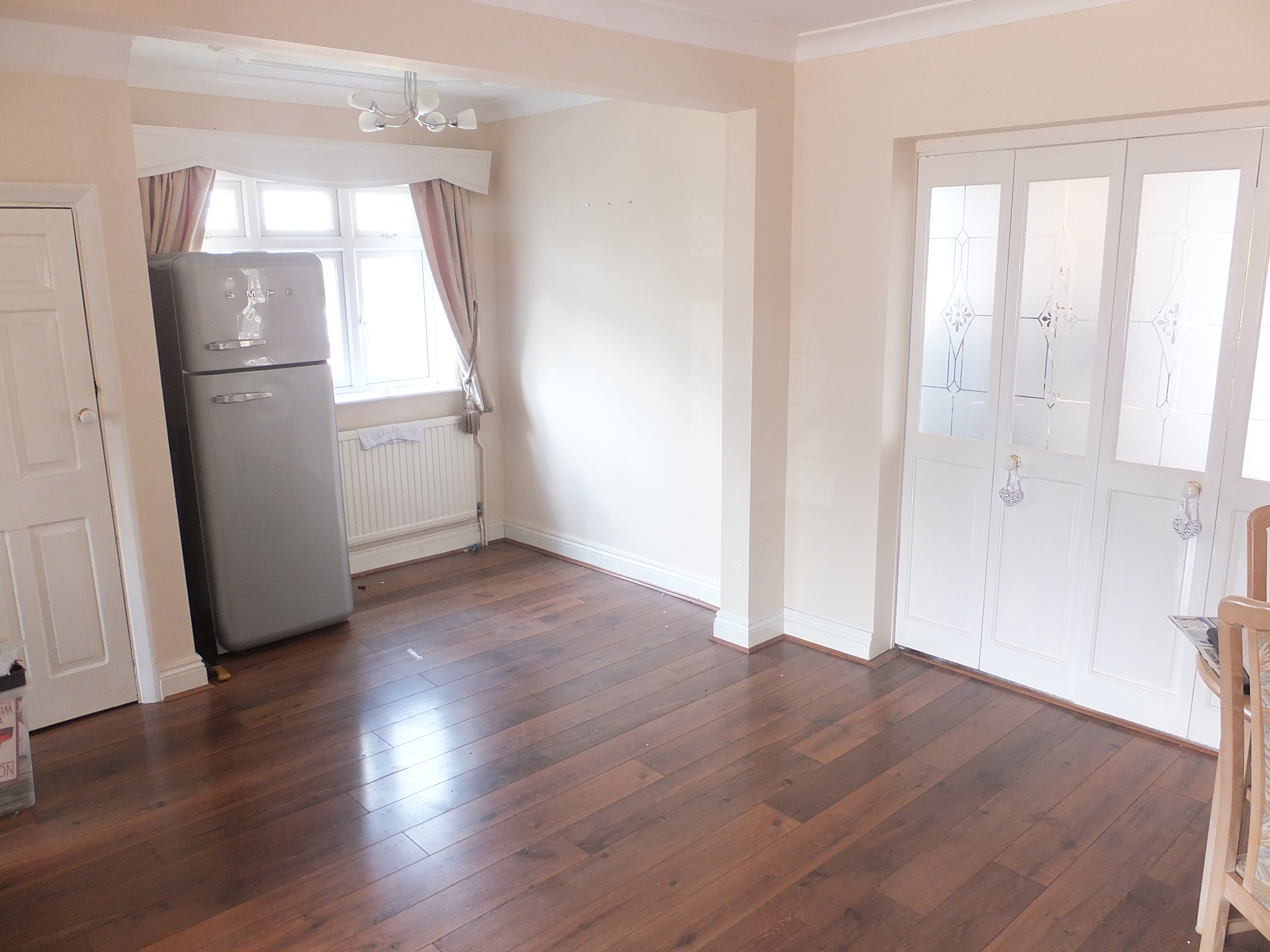 L shaped to 12’4″ Double Glazed bay to front elevation, additional double glazed window to side. Featured cast fire surround with inset gas fire, timber floor covering, 2 single radiators, cupboard housing central heating boiler. Double Doors opening into kitchen.
