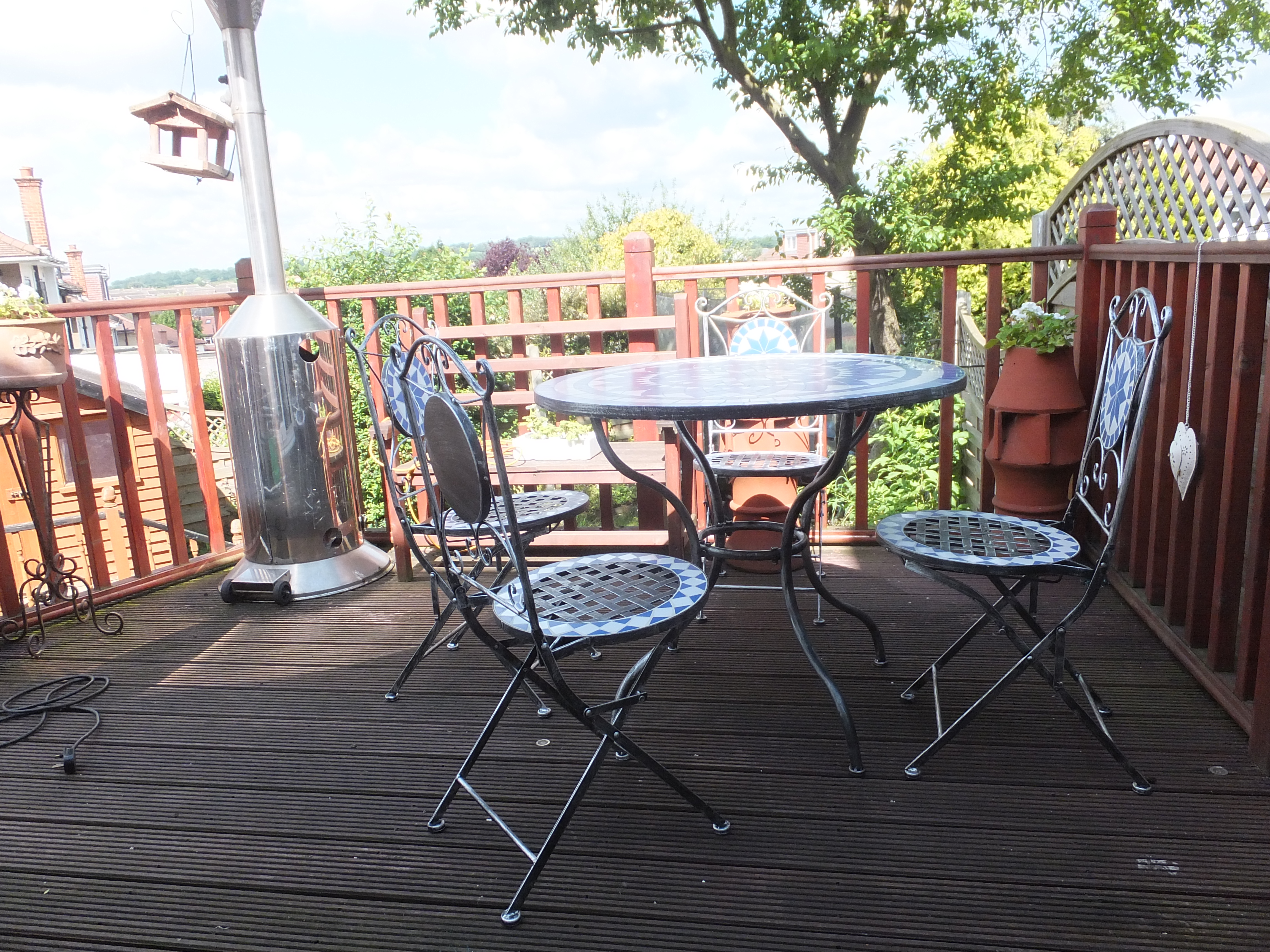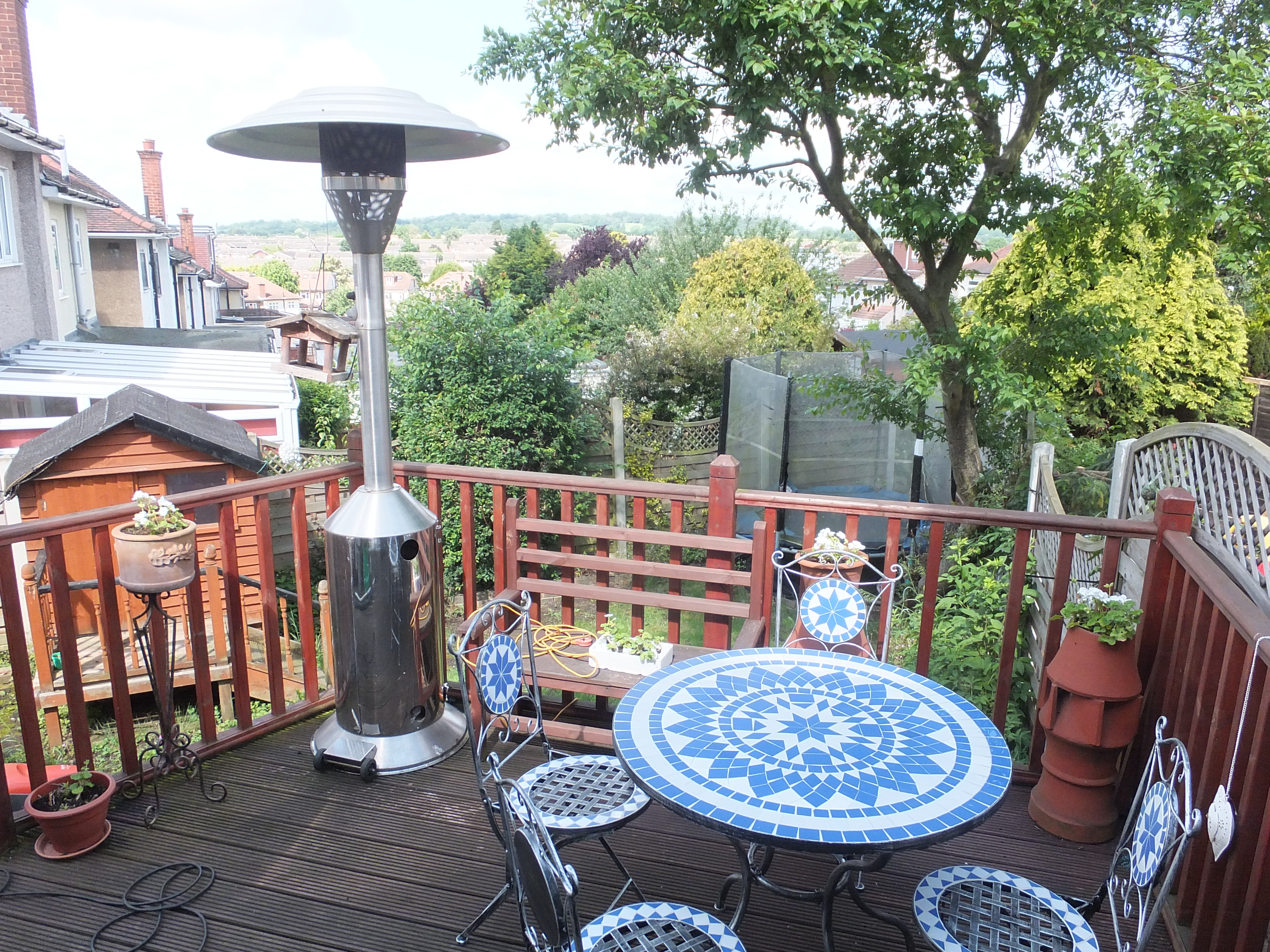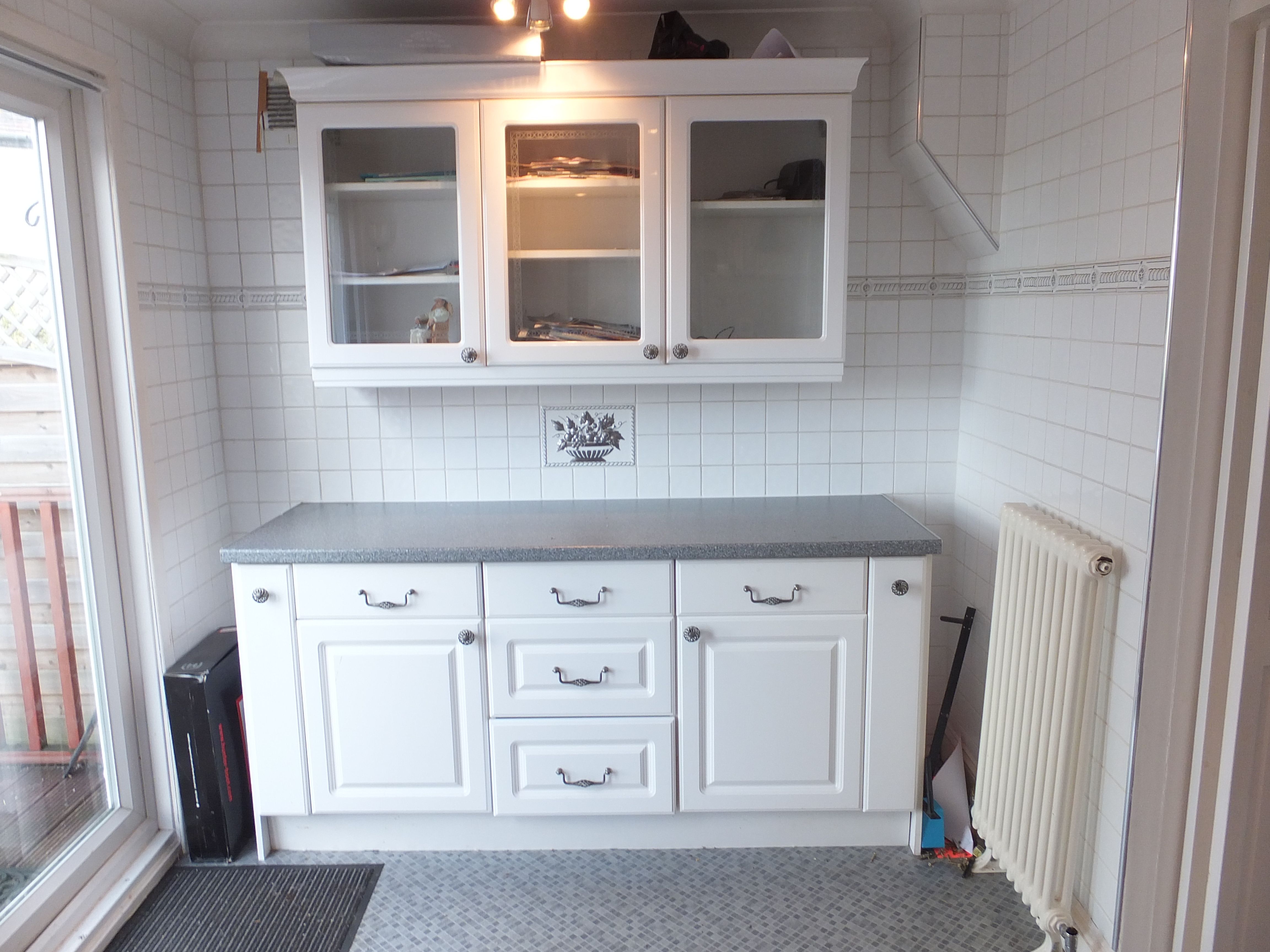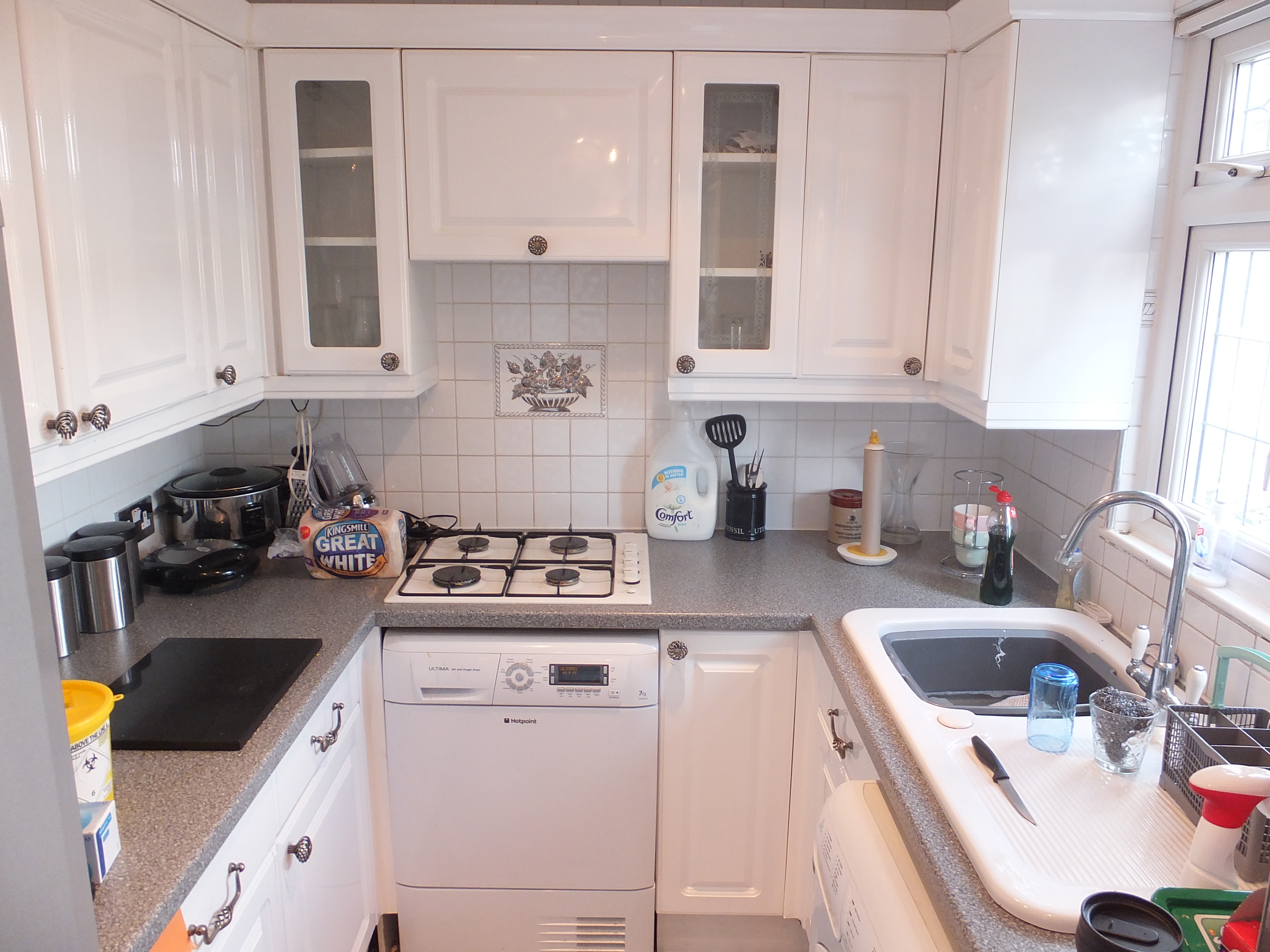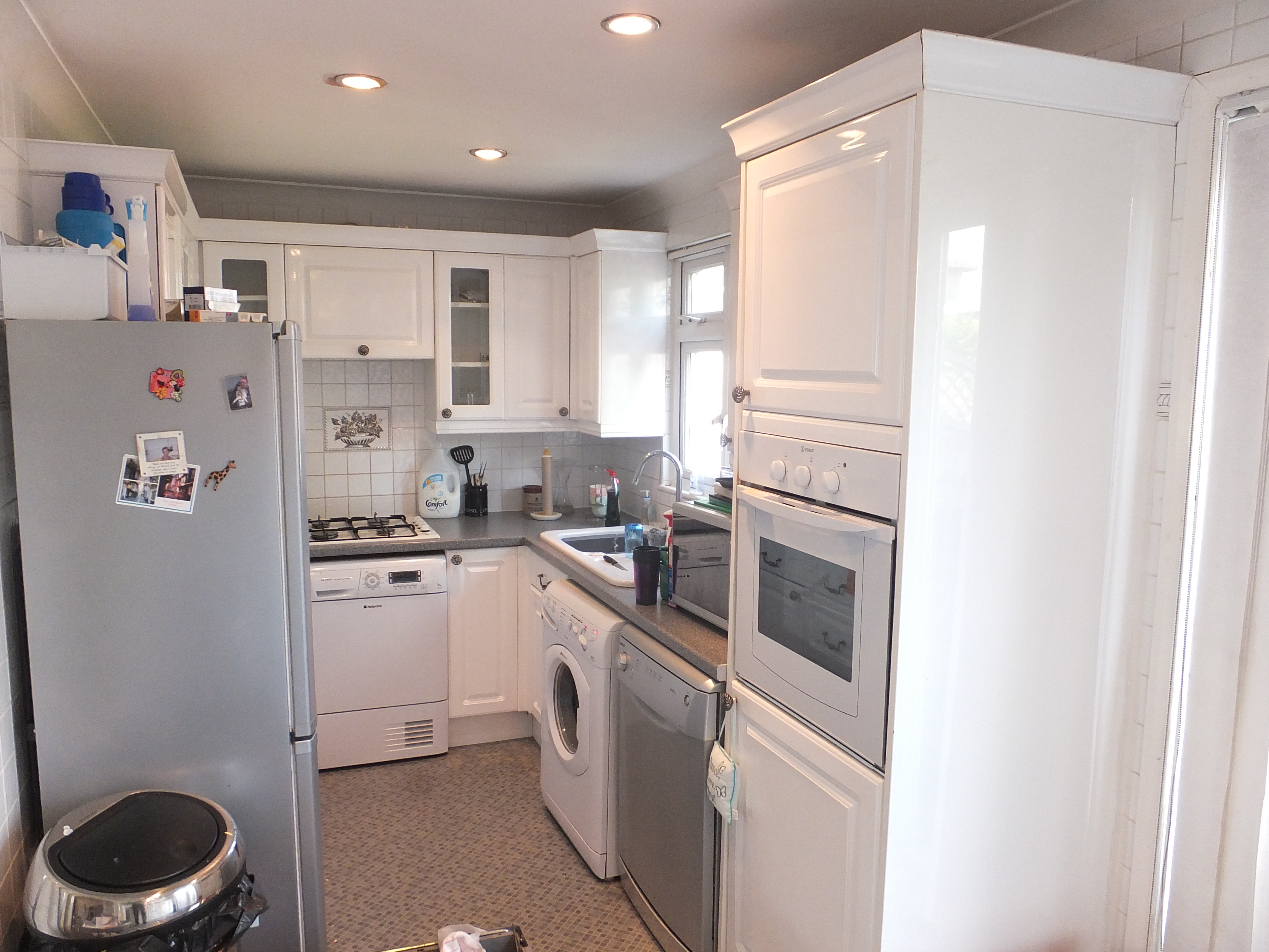 Fully fitted kitchen with range of whit wall and base units roll top work surfaces and tiled splash backs. Integrated 4 ring gas hob and electric oven, sink unit with mixer taps. Plumbing for washing machine and dish washer. Double glazed window overlooking rear garden and double glazed sliding door leading to decked veranda and garden.