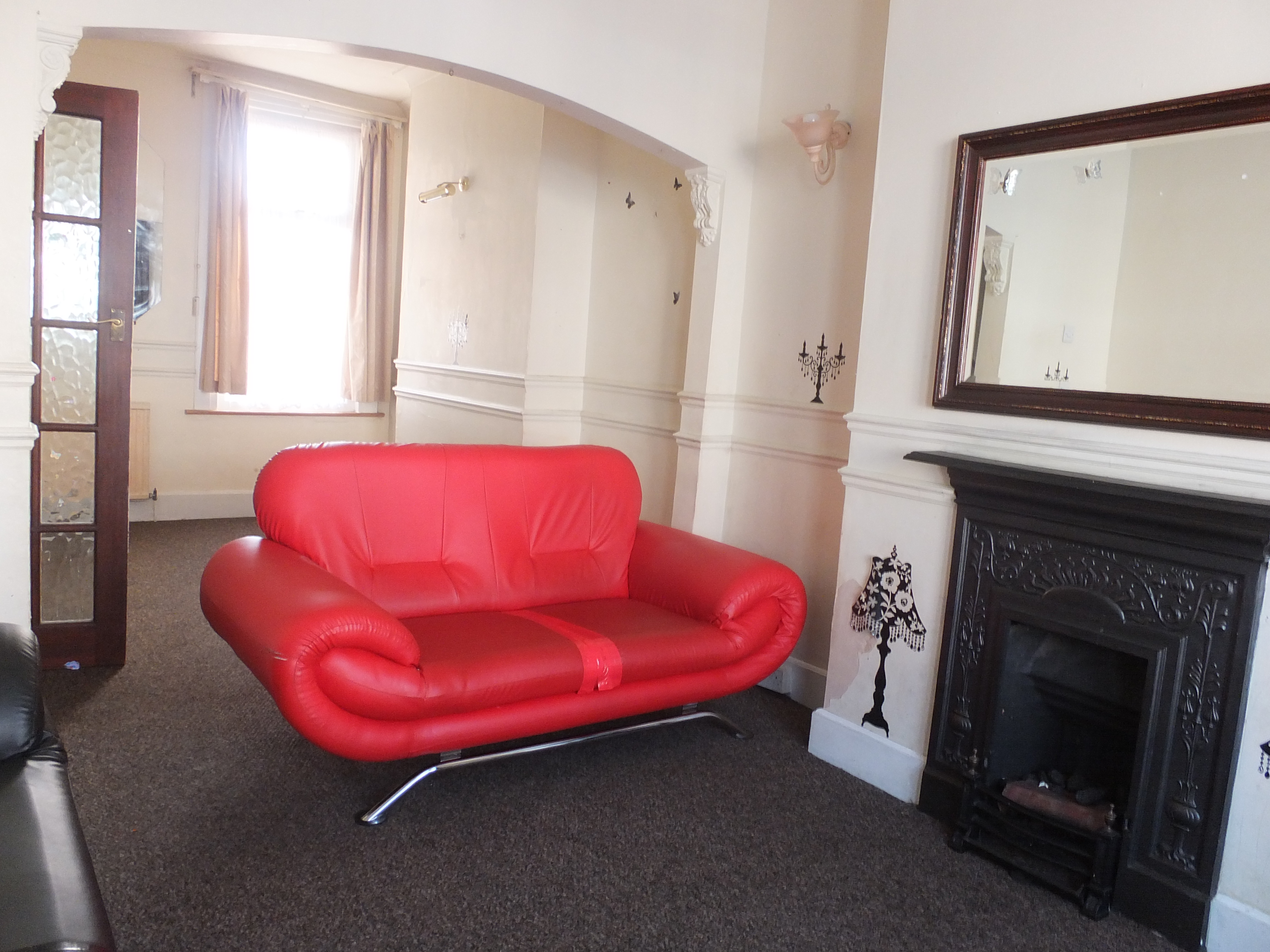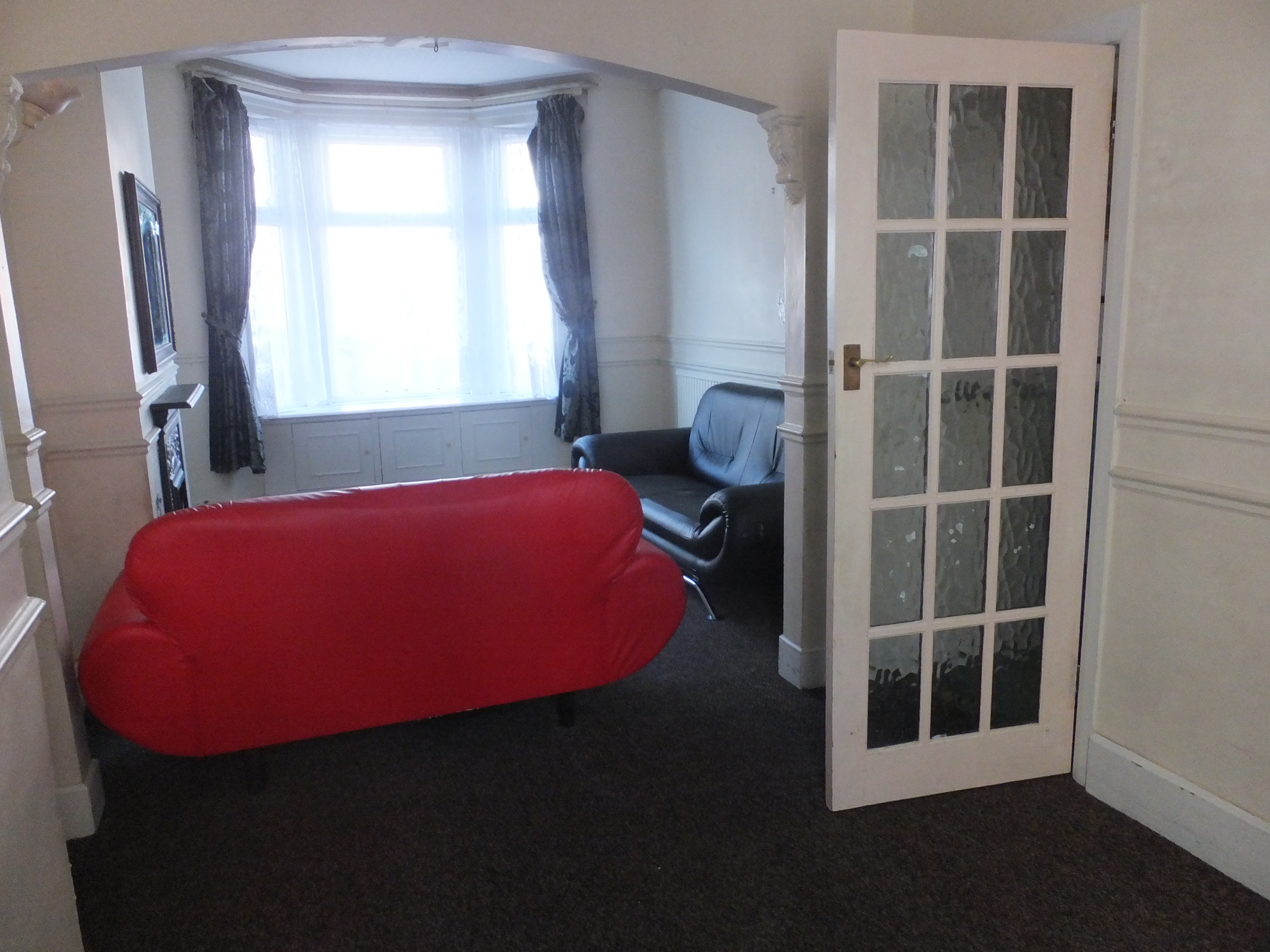 A through lounge with featured fire place, tiled inset and cast surround, double glazed bay to the front and double glazed window at the rear. One single radiator and one double radiator. Dado rails and cornicing, power points and TV point.
