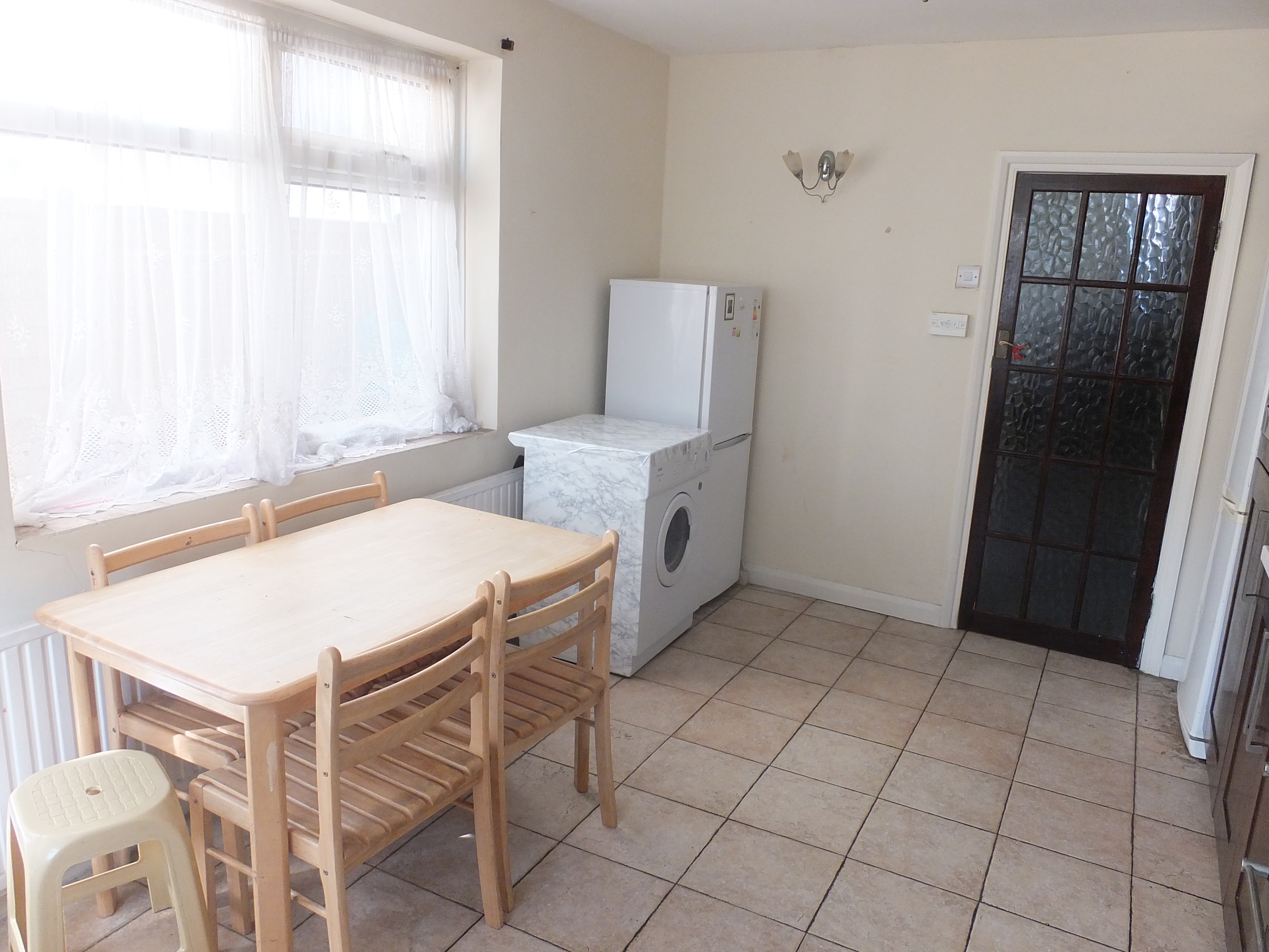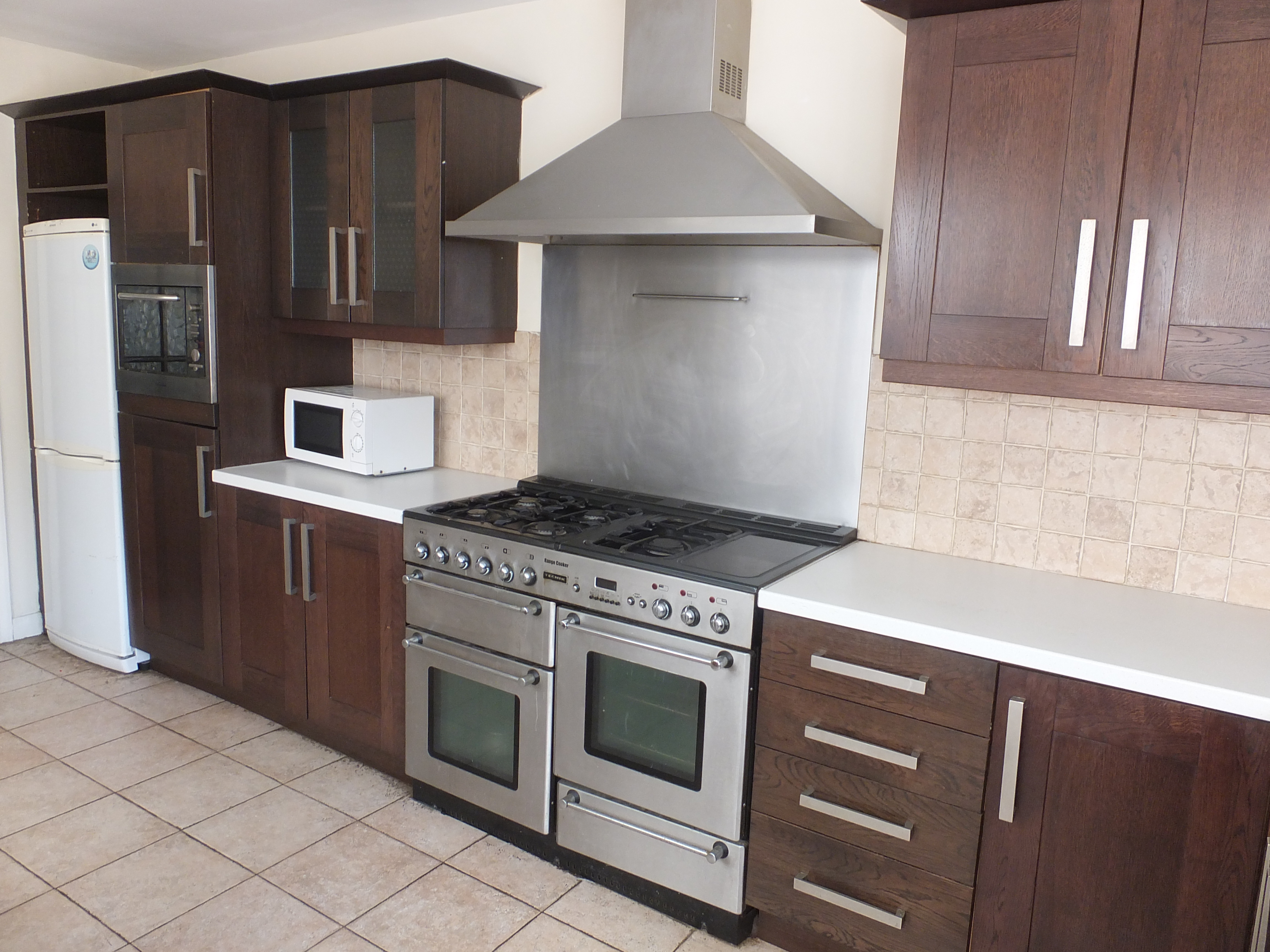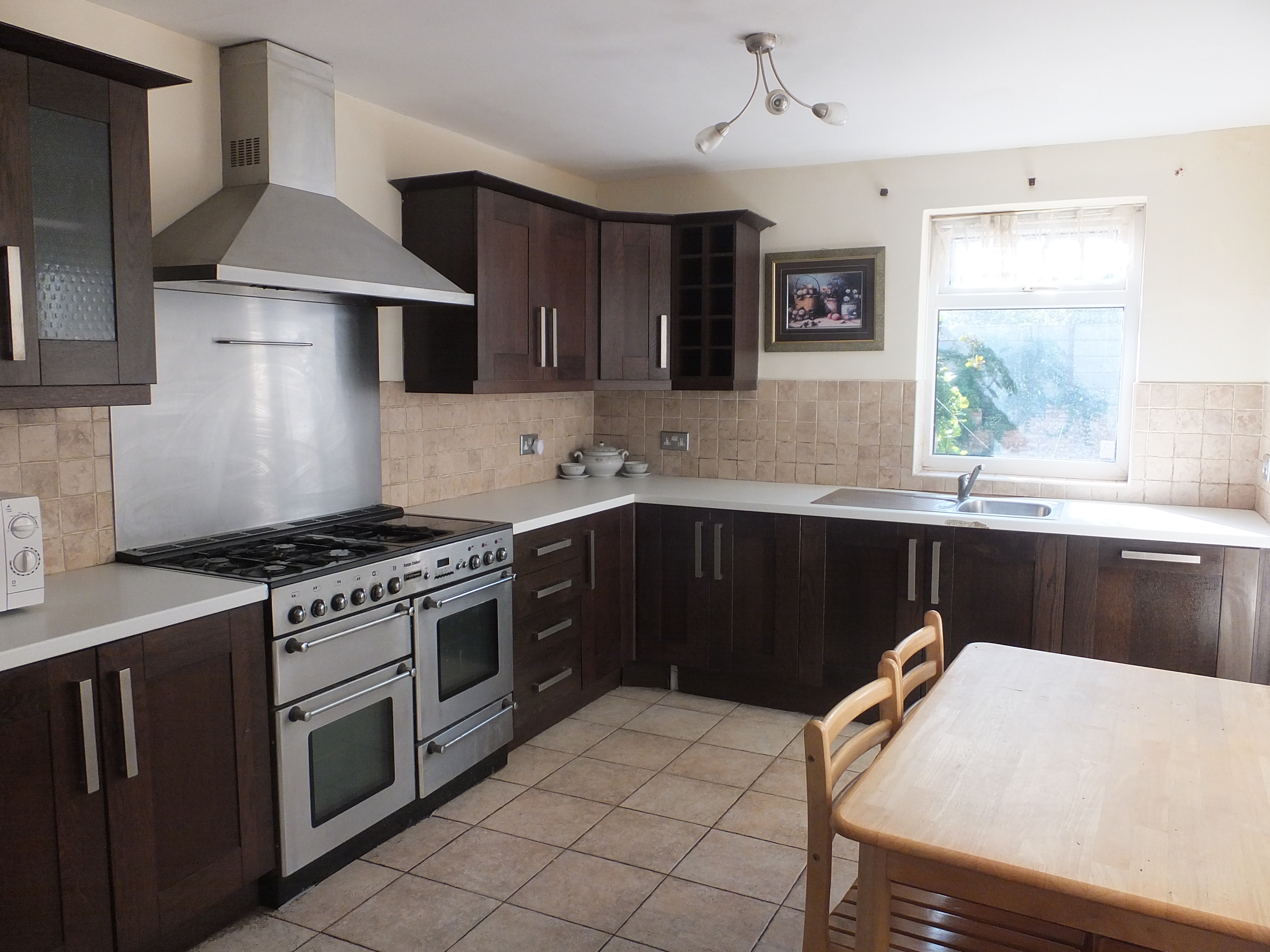 Spacious kitchen/diner with a full range of fitted wall and base units, with roll top work surfaces. Integrated Range oven with 5 ring gas hob and double oven. Also with integrated microwave and stainless steel single drainage sink unit with mixer taps. Double glazed windows to the side and rear of the room and double glazed door to the rear garden. Tiled flooring throughout the kitchen.