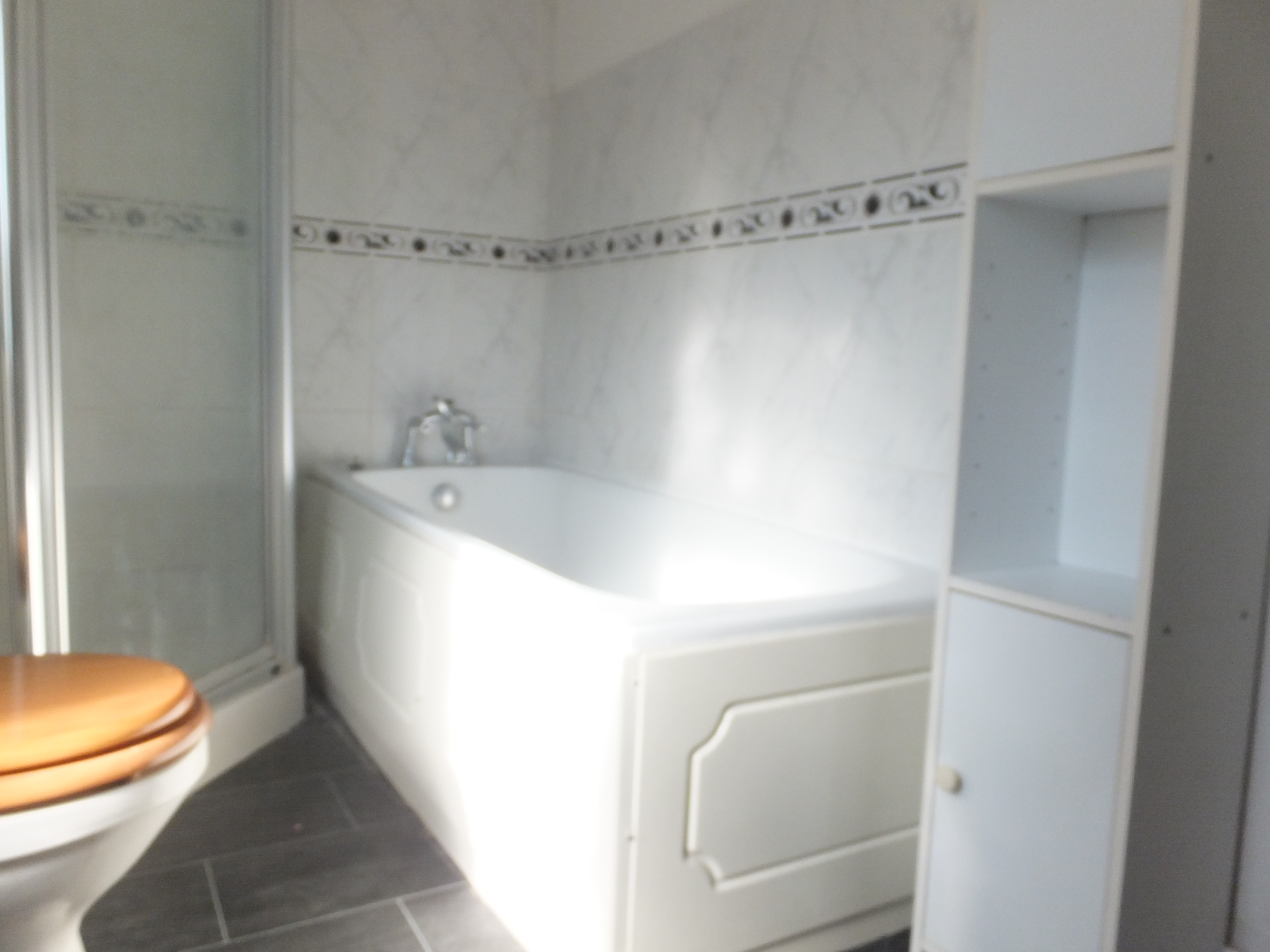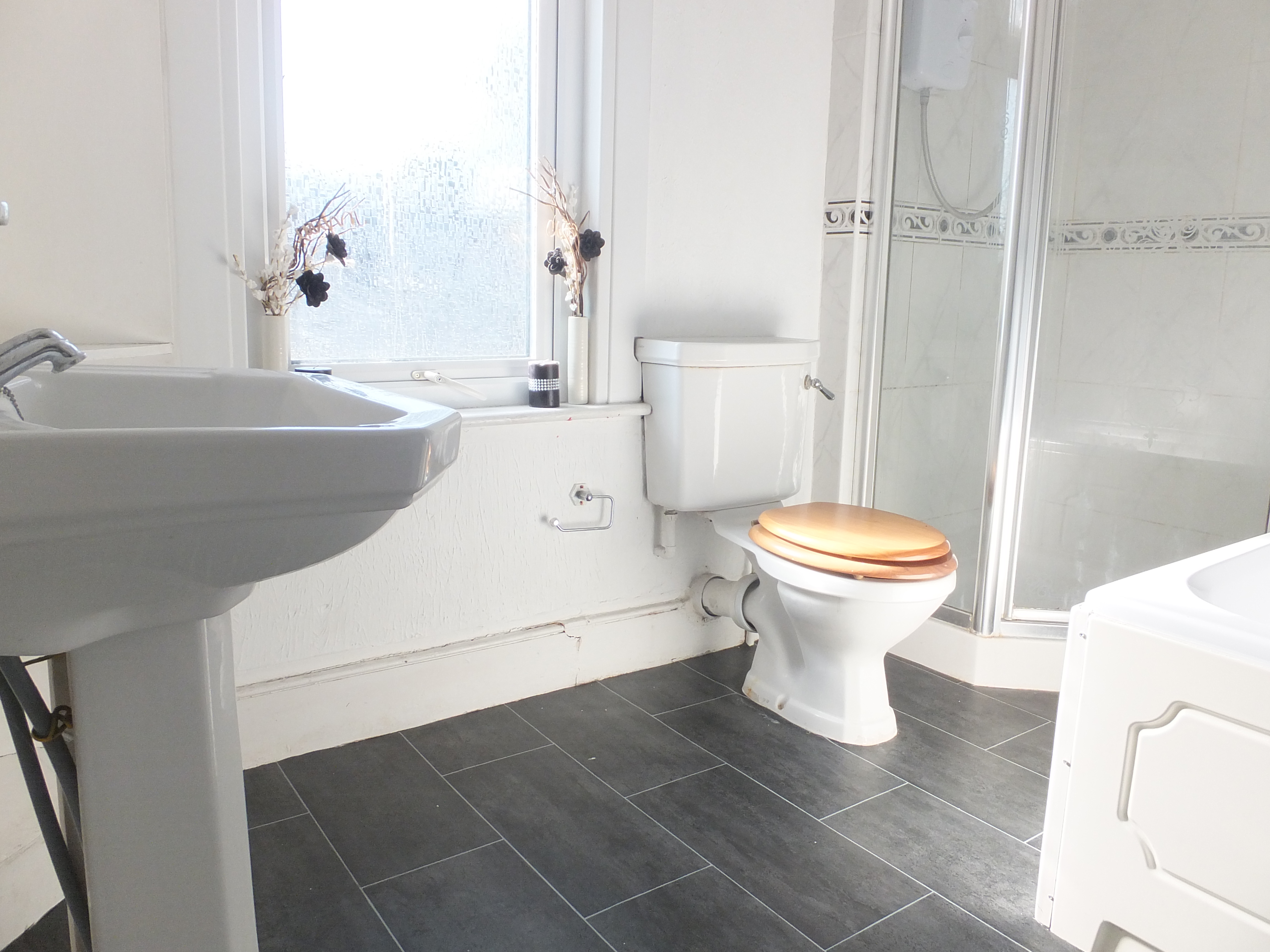 4 piece suite with panel bath with mixer taps, enclosed shower cubicle with Tritron shower, pedestal wash hand basin and low level water closet. Fully tiled with double glazed frosted window at the rear.
