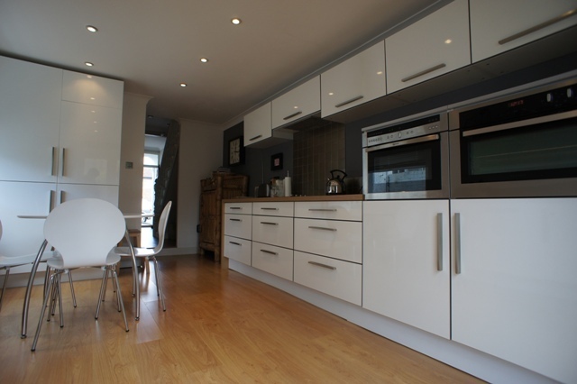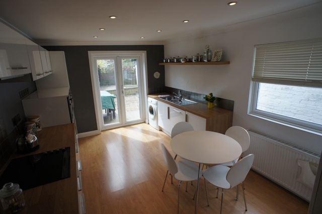 Double glazed window and door to garden, modern fitted wall and base units, sink drainer and laminate wood flooring to remain.