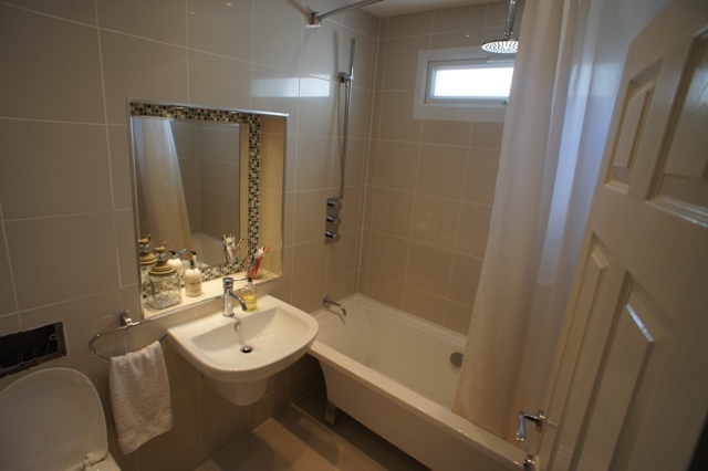 Three piece suite, comprising of low flush WC, bath with side panel mixer tap and shower attachment, pedestal sink with mixer tap, fully tiled walls, double glazed door to side aspect